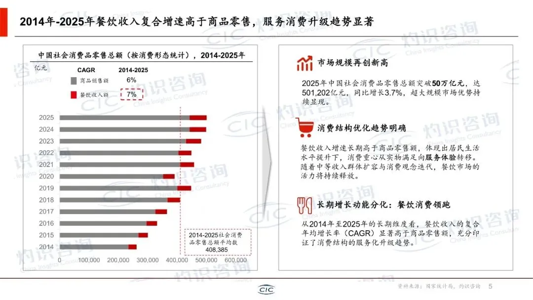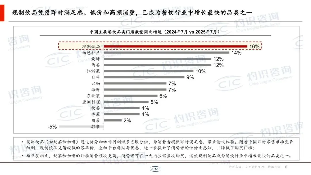 2025年中国GDP首次突破140万亿元,社零总额51.8万亿元,CPI同比0%,通缩压力仍存。餐饮收入2014-2025年CAGR 7%,高于商品零售6%,服务消费升级趋势明确。现制饮品凭借“低价+高频”成为餐饮增长最快品类,2024.7-2025.7门店增速16%,领先第二名烧烤2个百分点。政策端,2026“十五五”开局,湖南、四川等省首次将茶饮纳入地方茶产业规划,提出打造千亿级集群。