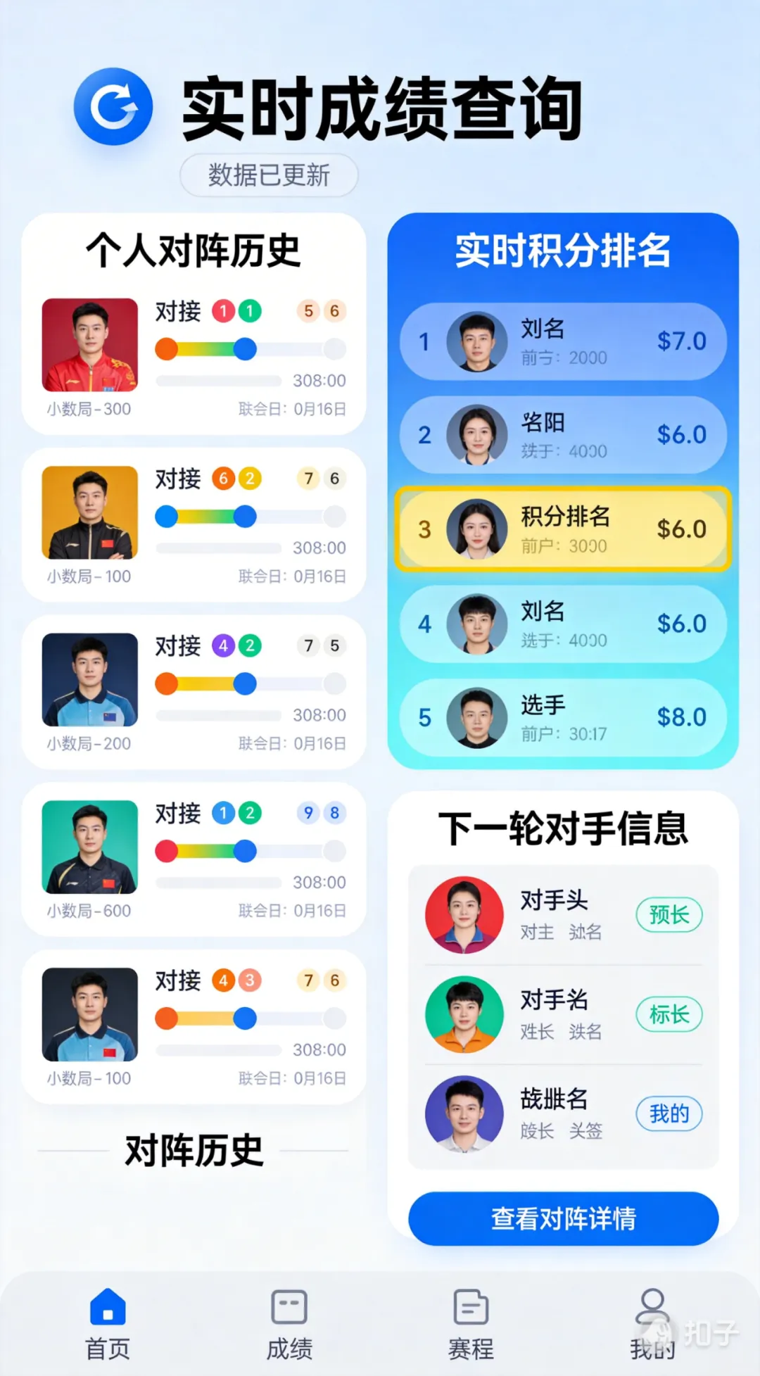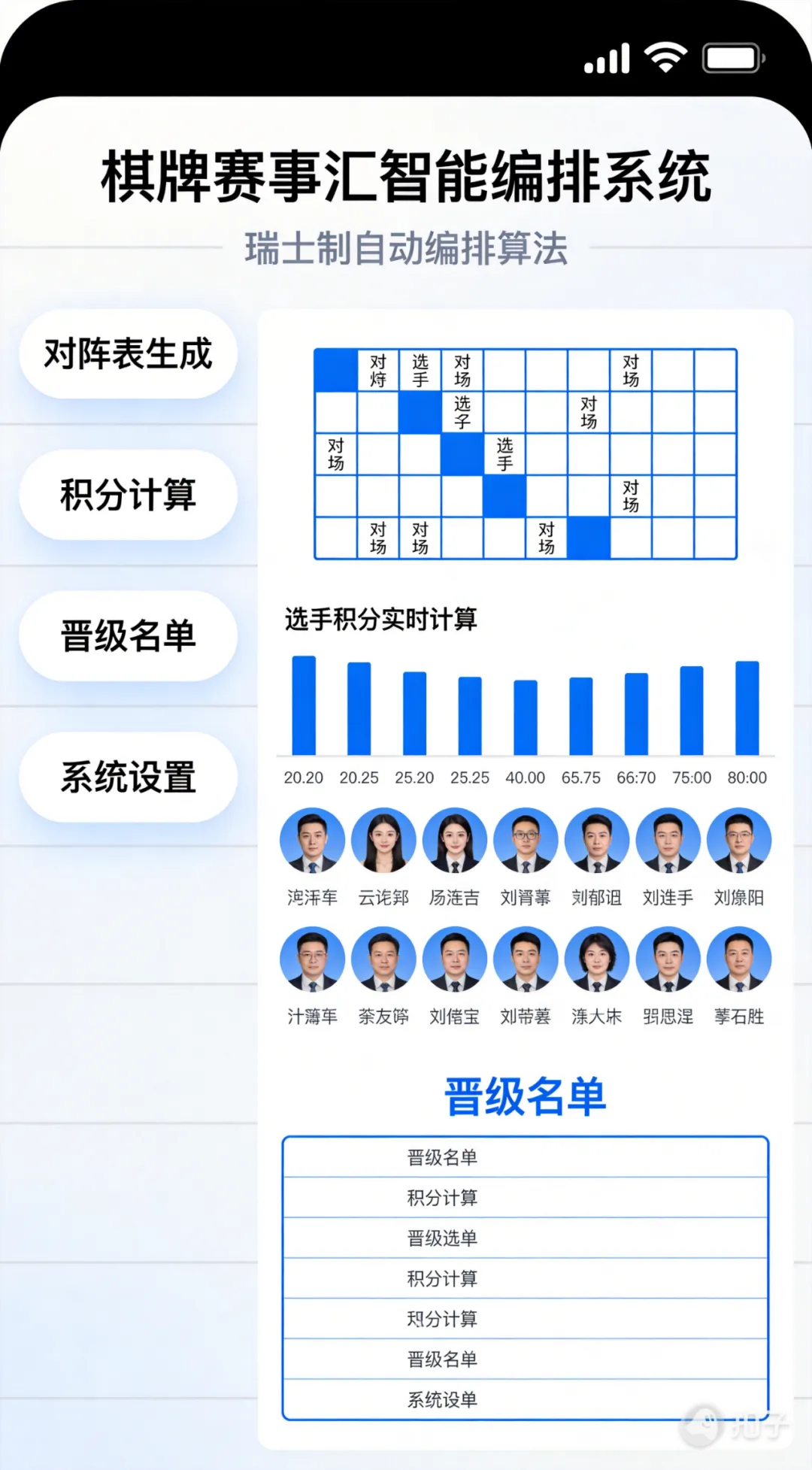实时成绩处理:裁判端便捷录入,系统自动计算积分、排名、晋级名单