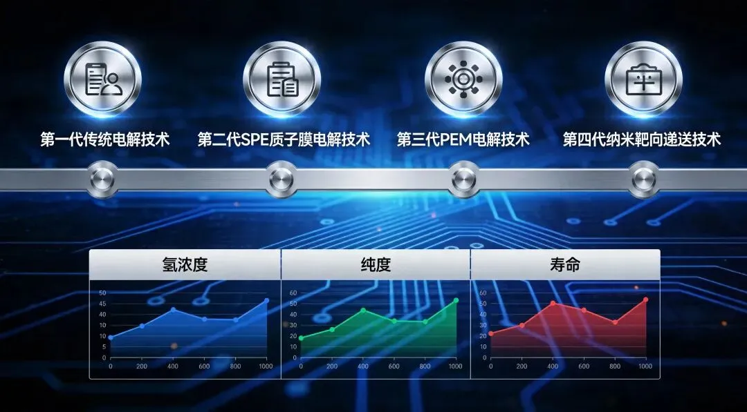 质子膜电解,氢浓度高(2.0-3.0ppm),纯度≥99.99%第三代:PEM电解技术(2025年至今)
