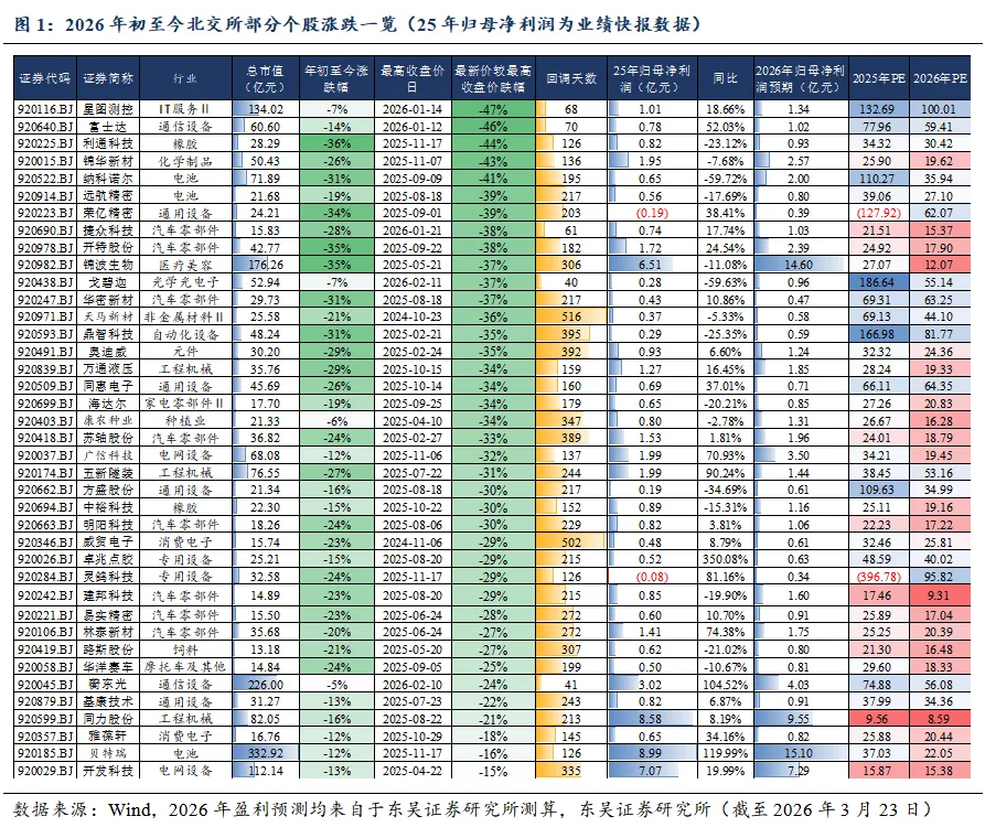 北交所紧紧围绕打造服务创新型中小企业主阵地定位,统筹多层次资本市场互联互通,截至26年3月23日,北交所上市公司达300家,专精特新企业占比约七成,其中2026年就已上市13家,新股上市节奏加快,截至2026年3月23日,26年初以来上市的公司25年平均净利润(业绩快报数据)达1.09亿元,助力北交所高质量扩容。