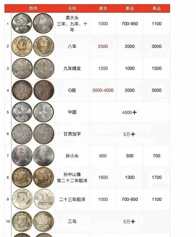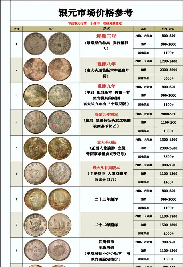 这第二个是袁大头八年,不少新手一对比第一款都看懵,其实区别主要在年份,八年、三年一比,数量少了不少,流通不多,表上写着1300到两千多一枚,成色高的价格直上三千多,市场一热,小票成珍品,老行家收这不是因为图便宜,是专门拿着补年份缺口,去年还有人专门发帖找八年,收齐一轮才有点意思,现在搞全套难度可不小。