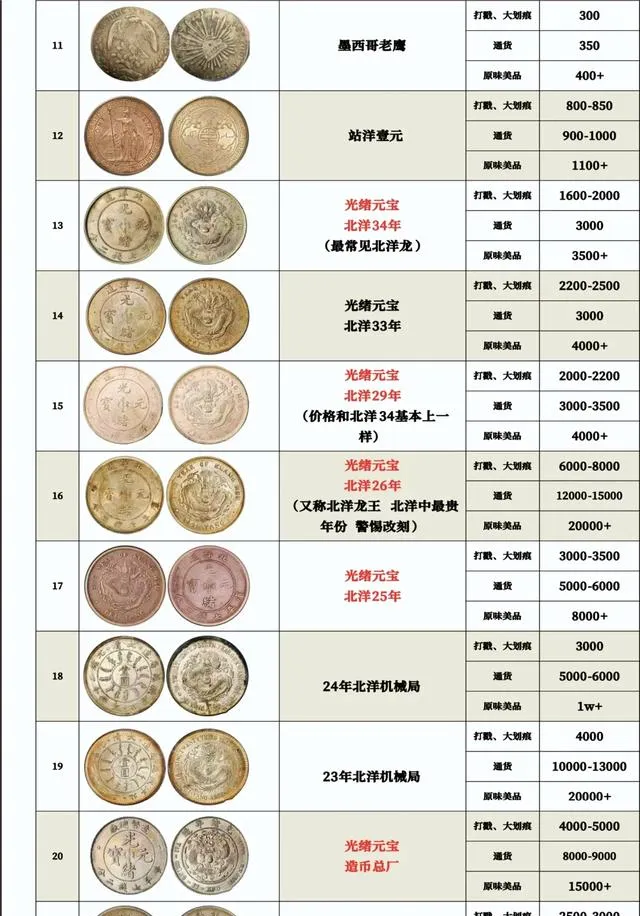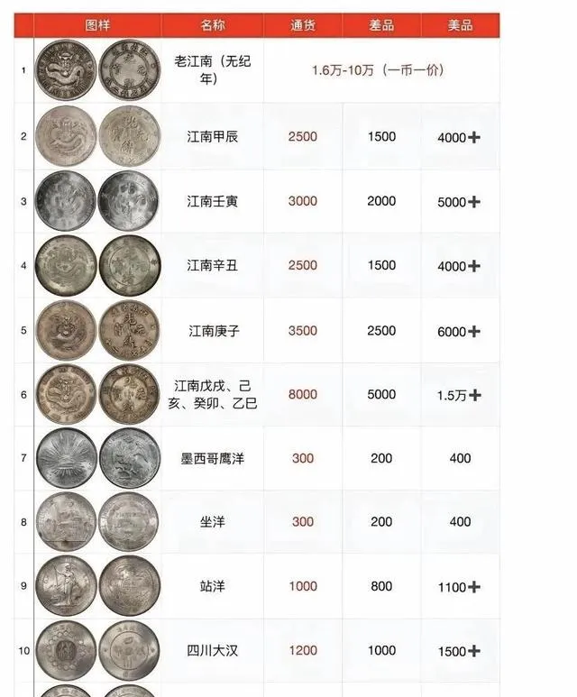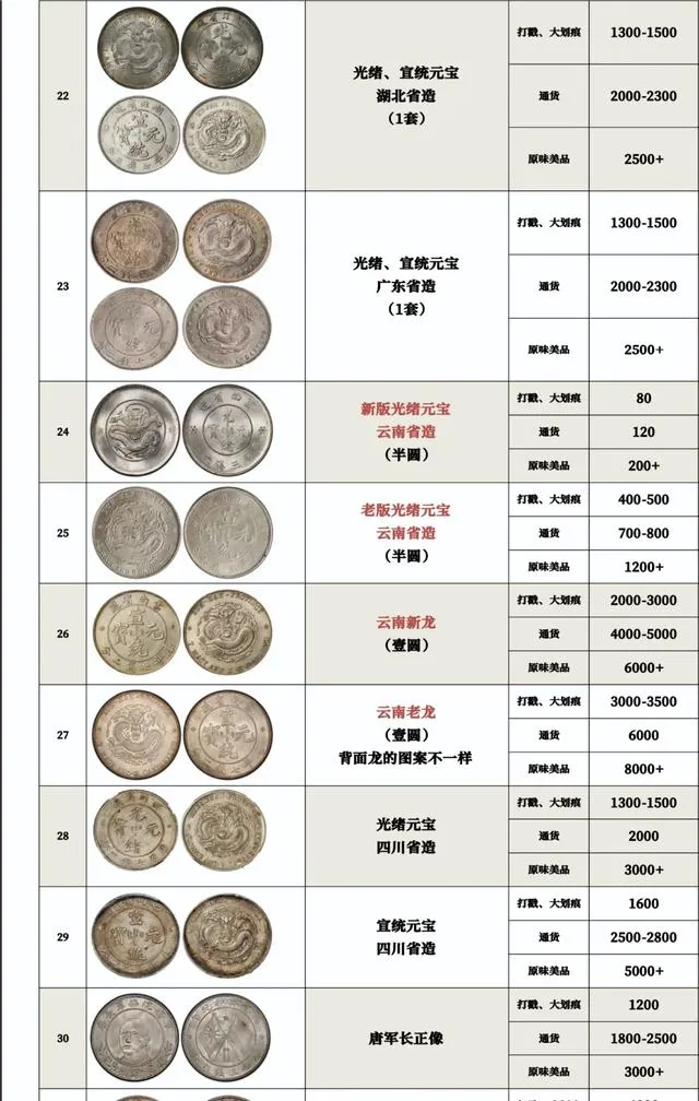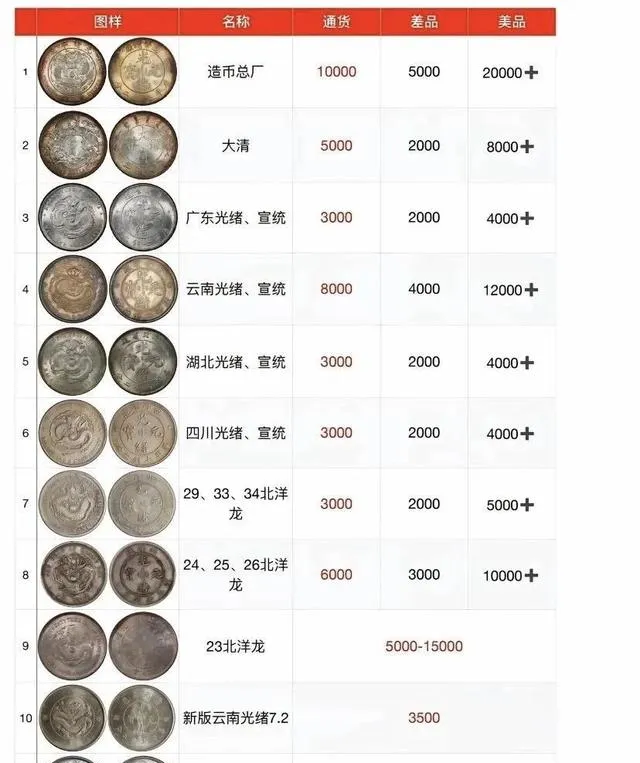广东老派喜欢的就这枚光绪元宝广东版,通票三千,美品能到五千,细节讲究讲的是“龙头有没有朝正”,花少钱淘大货不容易,表上写着价格浮动大,去市场上转一圈,收齐各省版八宝不见得比收几枚袁大头简单,有的银元背后故事比钱都重。