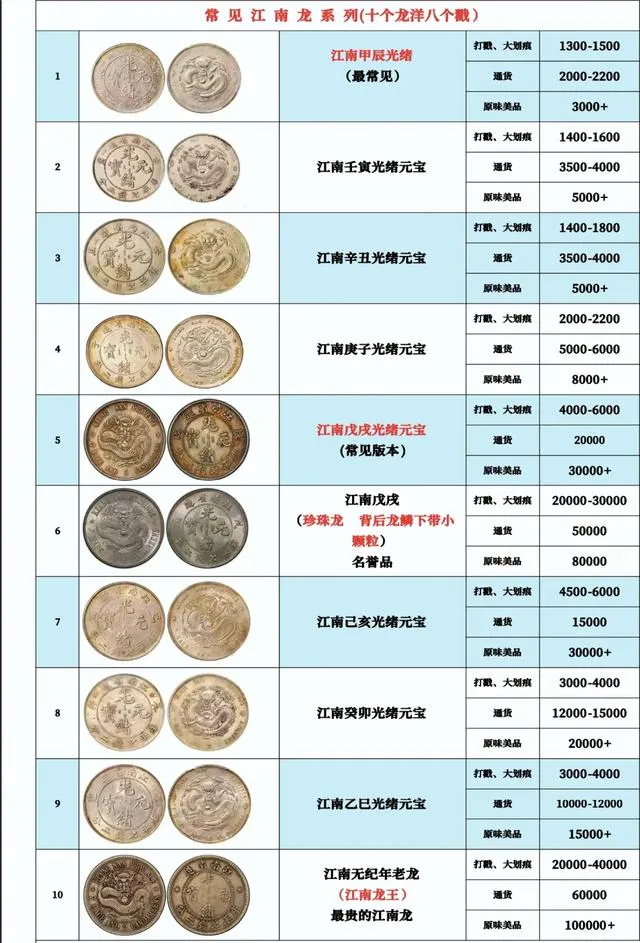 江南龙系列里,甲辰这一枚最出名也最保值,银白带青,有点老化包浆,真品一上手露头,手感温润,业内说稀缺,说的是它存世不多,像表上写的二千多到五千,生意好时能冲两三万,去年一位爷爷凑齐全套,直接存进银行保险箱,说“这东西放再久也不怕贬”,行家都晓得,江南龙年年有,真甲辰难遇上,拿来做压箱底的才放心。