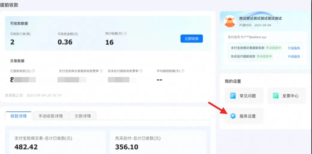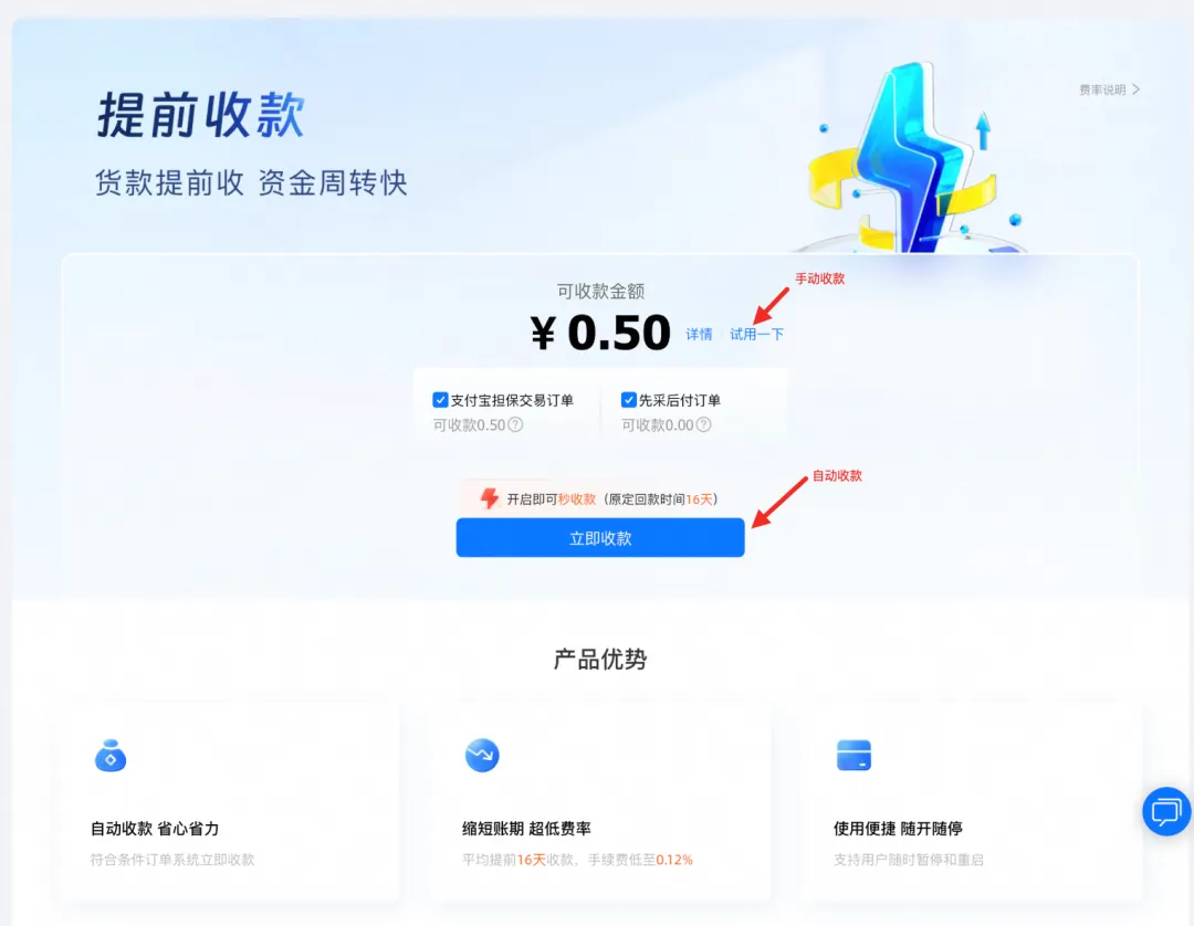 自动收款:开通提前收款服务后,符合条件的订单,可提前放款至店铺绑定的支付宝账户,到账后扣取服务费用;