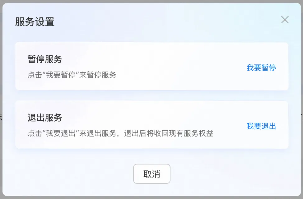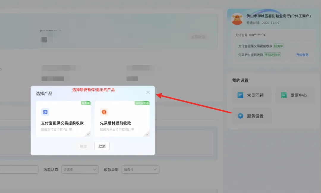 您进入“提前收款”页面后,点击服务设置-选择产品-选择“暂停服务”或“退出服务”即可操作暂停/退出。
