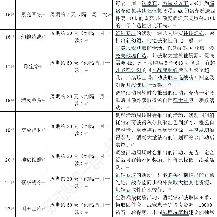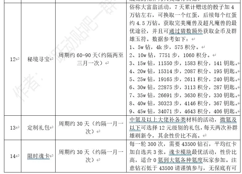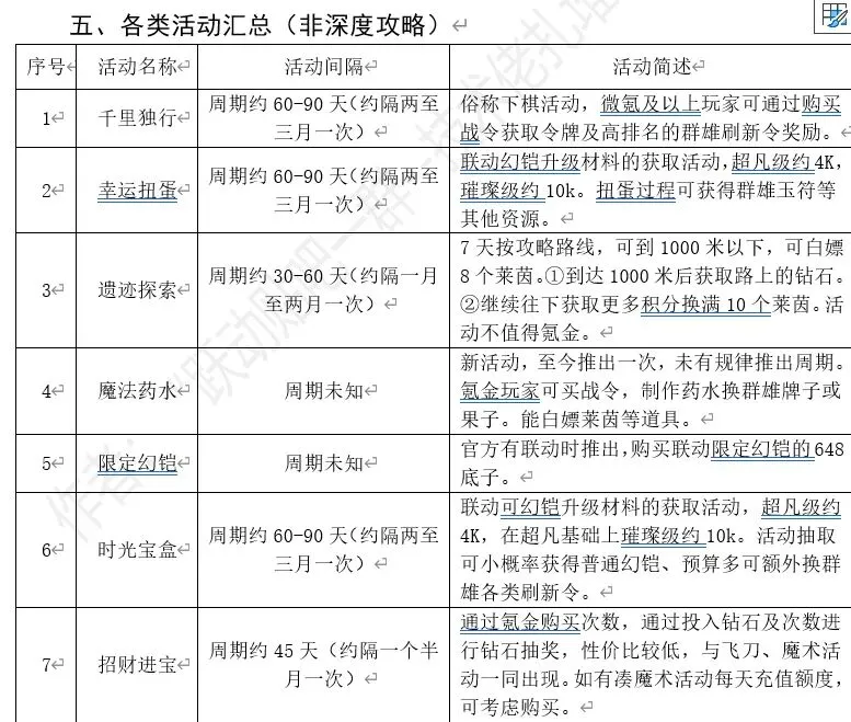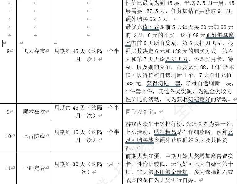 活动简述:这两个活动为一同推出的配套活动。其中飞刀为通过每天赠送、钻石购买、氪金购买的刀,进行夺宝,到达不同层数获得奖励,45层幻铠,另有红色四件套。魔术帽为通过每天充值开启帽子获得奖励,每天充值98元可获得全部奖励,第七天获得群雄红刷。性价比最高为到45层,按照平均4刀一层,45层需要180刀,任务加钻石共获取91刀,额外购买89刀。0氪可通过钻石购买的飞刀,白嫖莱茵、鸟珠、自选橙卡。最优充值方式是前5天每天买30元加68元的飞刀,可加购6元的达到100返钻。这样98元正好够拿魔术帽前5天所有奖励,第6天把刀飞完,根据当前层数与目标层数决定剩余飞刀礼包的购买方式。第6天和第7天无论是买飞刀,还是买月卡,特权,以及别的充值,都要充到98,这样魔术帽可以得群雄自选刷新1个,7天总计充值最低688元。获得幻铠一套,群雄自选刷新一块,4件套2件,其他各类资源,为氪金类较为性价比高的活动,同为获取幻铠最好的活动。小技巧:飞刀可以夺取累积的钻石奖励,0氪玩家可通过观察目前钻石累积情况,然后使用飞刀获取大量白嫖钻石。