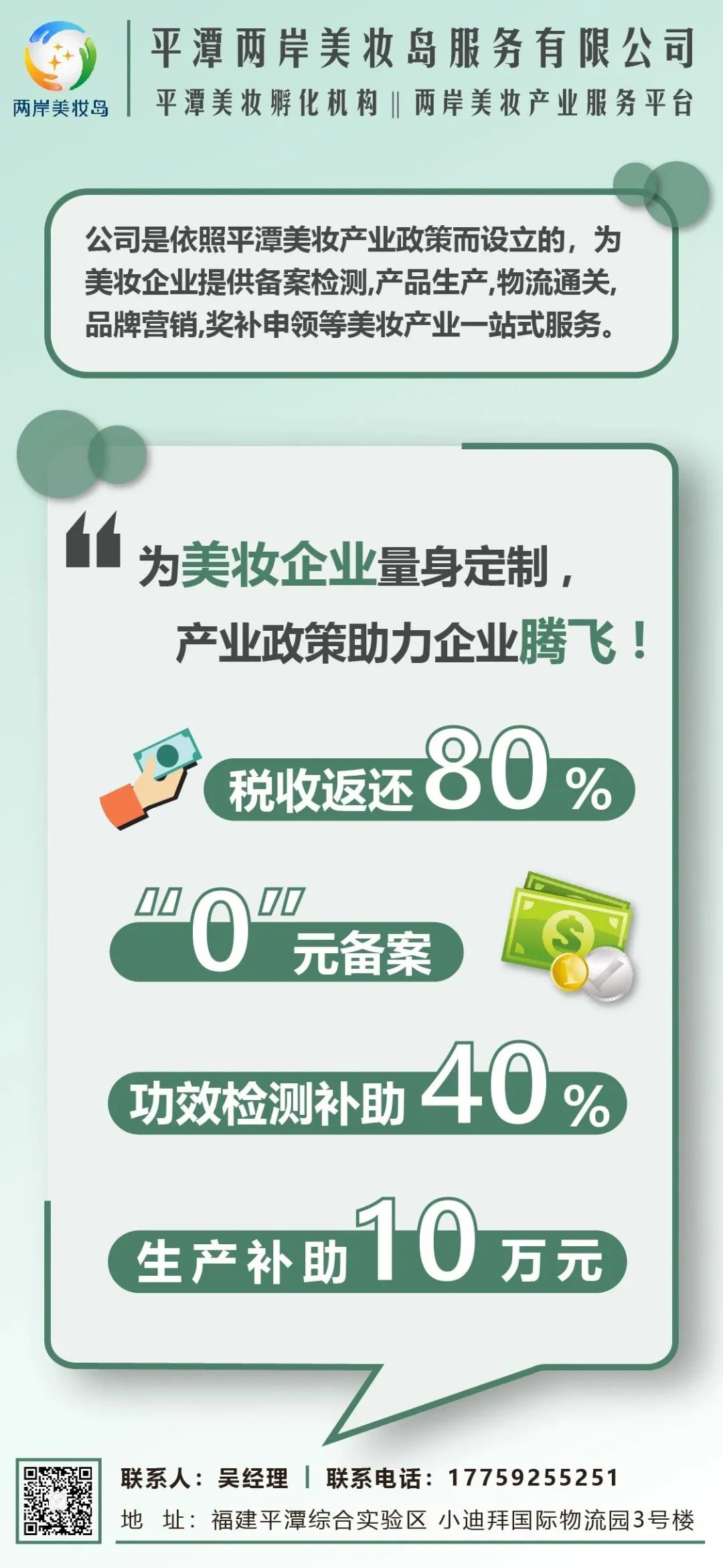 平潭两岸美妆岛服务有限公司建立的“两岸美妆产业服务平台”,致力于提供一系列美妆产业链的服务,在产品研发、备案检测、生产物流等方面给予企业补助,更有“0”元备案,化妆品生产最高补贴10万元,税收最高返还80%等国内优惠的化妆品产业政策,大大降低企业经营成本,助力企业腾飞!
