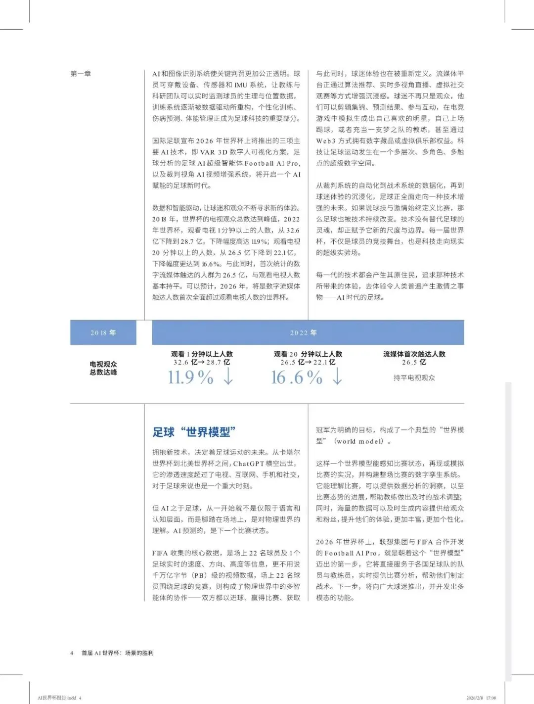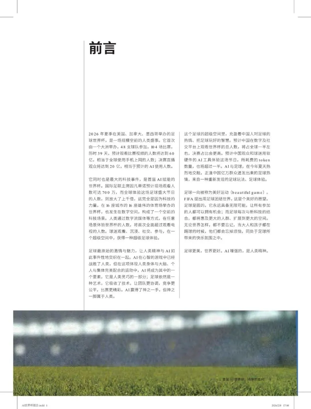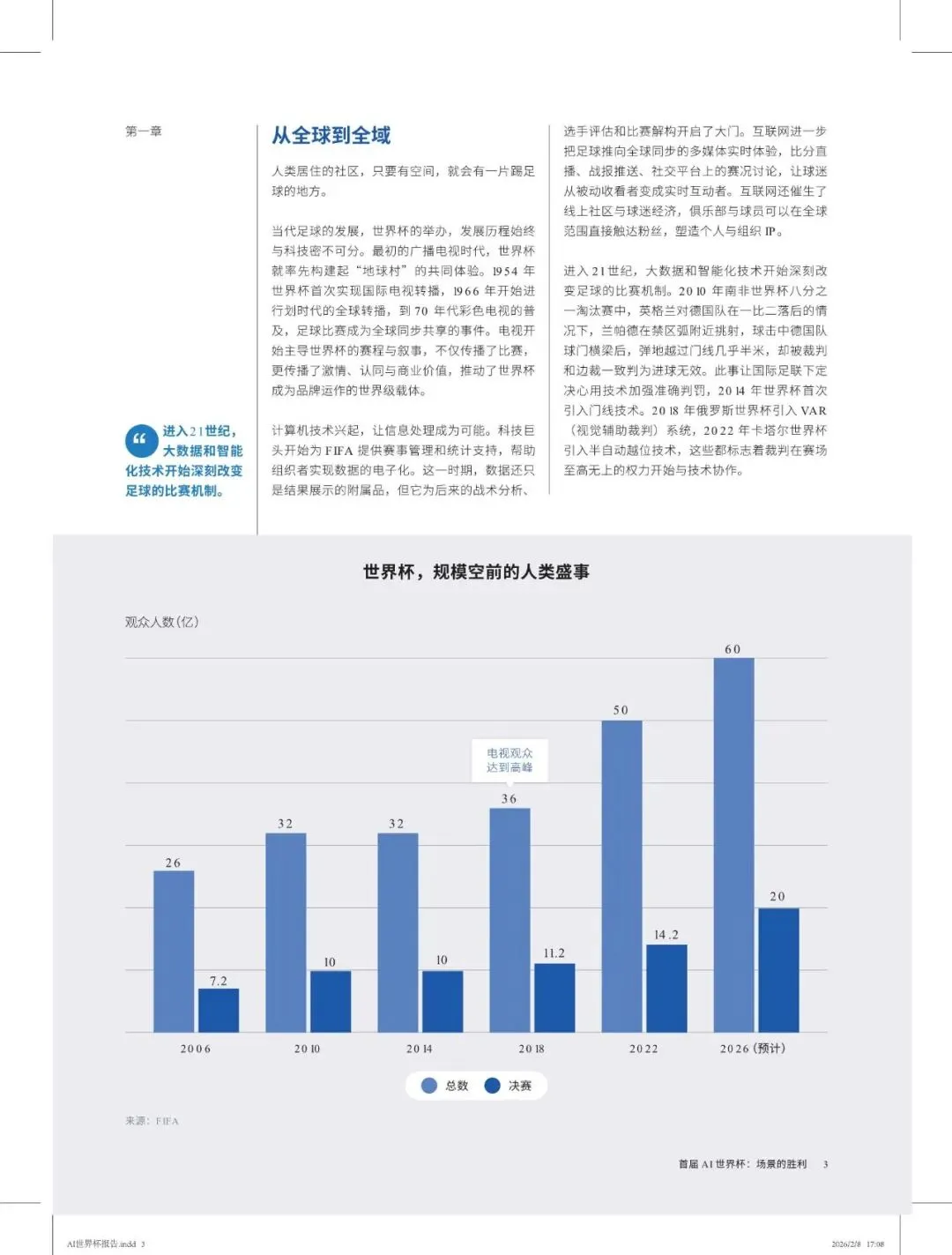 2026 年夏季在美国、加拿大、墨西哥举办的足球世界杯,是一场规模空前的人类盛事。它首次由一个大洲举办,48 支球队参加,104 场比赛,历时 39 天,预计观看比赛视频的人数将达到 60亿,相当于全球使用手机上网的人数;决赛直播观众将达到 20 亿,相当于预计的 AI 使用人数。