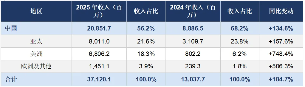 美洲市场从几乎空白到爆发,2026年基数大幅提升后增速将有所回归。