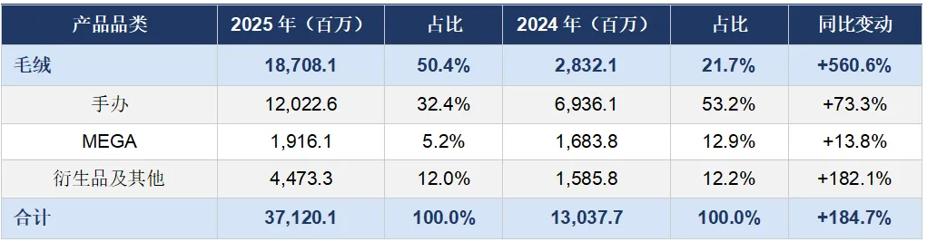 毛绒品类引领增长:毛绒产品收入同比增长560.6%至187.1亿元,首次超越手办成为最大收入品类,占比达50.4%。