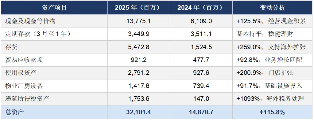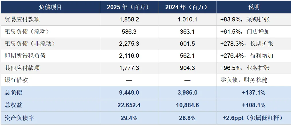 存货分析:存货从15.2亿元增至54.7亿元,增幅259%,存货周转天数从102天延长至123天。存货增长主要是支持海外业务扩张(运输周期长)和全球门店净增109家所需,属于主动备货,风险可控。但需关注若海外需求不及预期,可能面临一定存货压力。