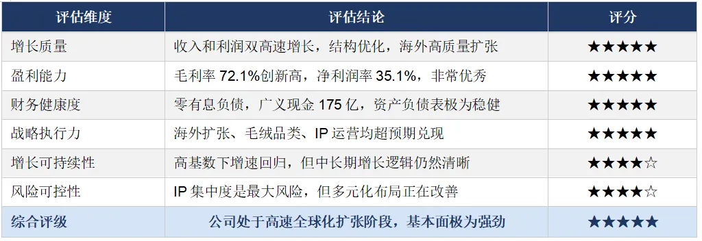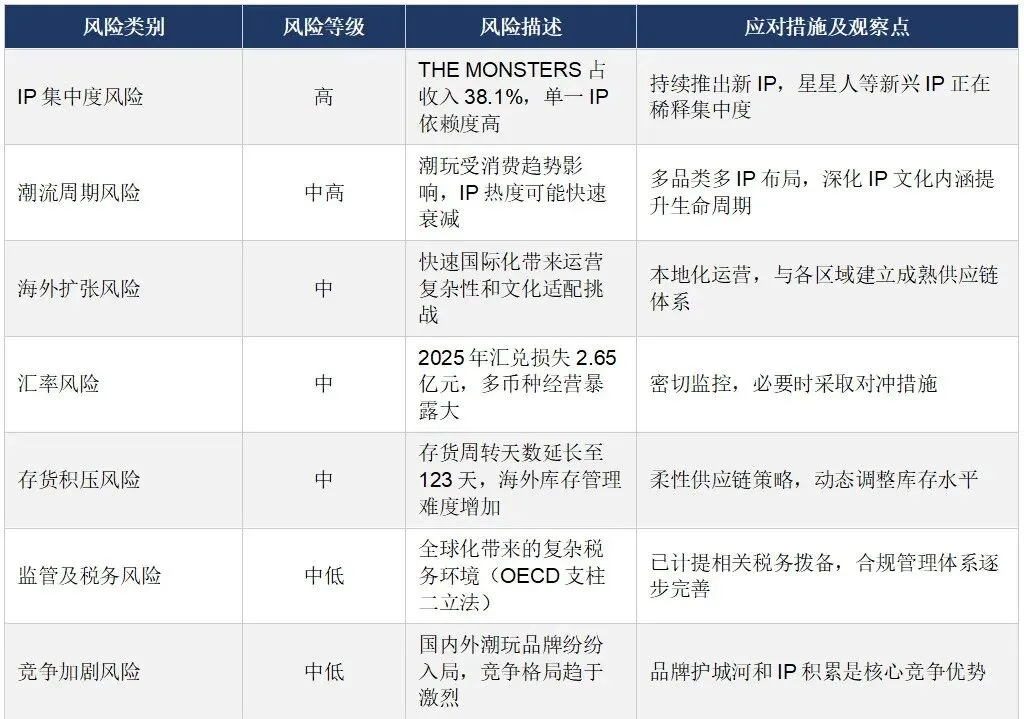 IP集中度风险: THE MONSTERS单一IP占总收入38.1%,虽彰显头部IP的巨大变现潜力,但也意味着若该IP热度下滑,将对整体业绩产生显著影响。值得关注的是,星星人以1602.5%的增速成为年度最大黑马,MOLLY则是增速最慢的核心IP(+38.4%),需持续关注其生命力延续。