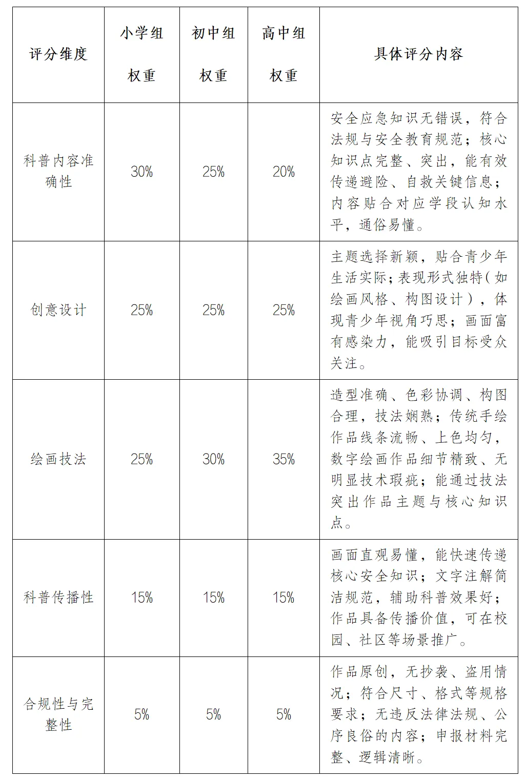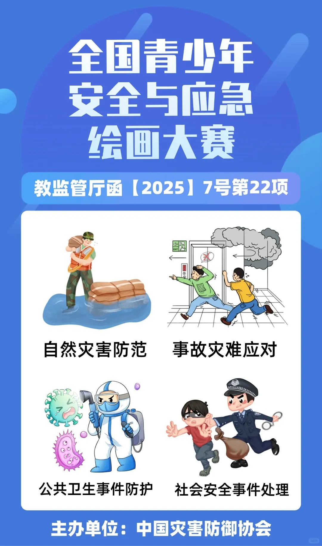 围绕自然灾害防范、事故灾难应对、公共卫生事件防护、社会安全事件处理四大核心场景进行创作。传统手绘类支持中国画、儿童画 、油画、素描、速写、水彩、水粉等传统绘画形式,工具无特殊限制,需保证作品整洁、无破损。数字绘画类支持合法合规的绘画工具或生成软件工具,作品需导出为高清图片格式(JPG/PNG, 分辨率不低于300dpi)。传统手绘作品:中国画作品四尺斗方( 69*68cm),误差不超过 2 厘米;儿童画 、油画、素描、速写、水彩、水粉等画种尺寸为四开 、八开, 误差不超过 2 厘米。数字绘画作品:设计稿尺寸/电子画布规格为 A3 ,竖向或横向构图, 文件大小不超过50MB,需附作品源文件(如PSD、Procreate 文件)或导出高清图,提交时注明作品名称、作者信息。(1)传统手绘作品:省赛提交电子照片;国赛邮寄作品原作(中国画四尺斗方(69*68cm),误差不超过 2 厘米;儿童画、油画 、 素描 、速写 、水彩 、水粉等画种为四开 、八开,误差不超过 2 厘米)。(2)数字绘画作品:设计稿尺寸/电子画布规格为 A3 ,竖向或横向构图, 文件大小不超过50MB,需附作品源文件(如PSD、Procreate 文件)或导出高清图,提交时注明作品名称、作者信息。作品需为原创,不得抄袭、临摹他人作品或盗用网络素材,数字绘画需保证所有元素为原创或使用合规授权素材。画面不得包含违反法律法规、公序良俗的内容,不得出现血腥 、暴力 、恐怖等引起不适的画面。文字注解需简洁规范(不超过 50 字), 字体清晰易读,与画面风格协调, 不得出现错别字或错误安全知识。 大赛主要考察和测验青少年在自然灾害防范(如地震、洪水、台风等)、事故灾难应对(如火灾、交通事故、工业事故等)、公共卫生事件防护(如传染病防控、食品安全等)、社会安全事件处理(如防恐防暴、网络安全等)以及应急救援技能、安全与应急科普创意设计与科技创新等方面的知识和能力,旨在提升青少年安全与应急知识和应急避险、自救互救技能,培养青少年宣传和沟通能力,激发青少年创新潜能,增强全社会安全防范意识与应急能力。