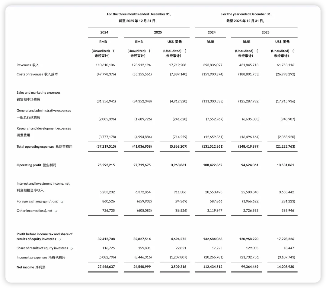 2025 年拼多多总收入 4,318.5 亿元,同比增 10%(2024 年为 3,938.4 亿元)。其中 Q4 收入 1,239.1 亿元,同比增 12%,略高于全年增速,说明经过前几季承压后 Q4 有一定修复。2025 年营业利润 946.2 亿元,同比下降 13%;非 GAAP 营业利润 1,025.6 亿元,同比同样降 13%。归母净利润 993.6 亿元,同比下降 12%;非 GAAP 归母净利 1,073.0 亿元,同比下降 12%。财报中明确,拼多多的非 GAAP 指标,仅剔除两类非经常性项目:股权激励费用(Share-based compensation expenses,SBC),非现金支出,无实际现金流出;特定投资的公允价值变动损益(17.54亿),与电商核心经营无关的非经常性损益。