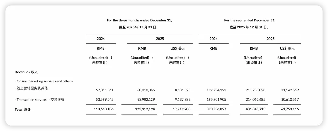 - 2025 Q4:广告 600.1 亿元(+5%),交易服务 639.0 亿元(+19%)交易服务,首次在季度维度上明显超过广告,是明显超越!