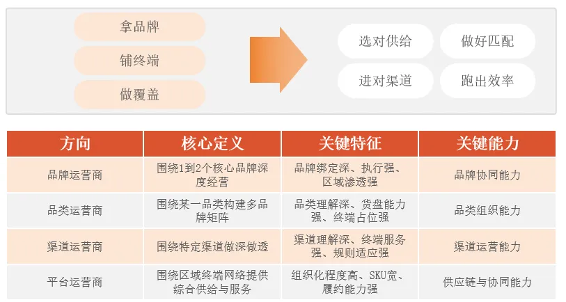 第一、品牌运营商。围绕1到2个核心品牌深度经营,优势是品牌绑定深、区域渗透强、执行力强。