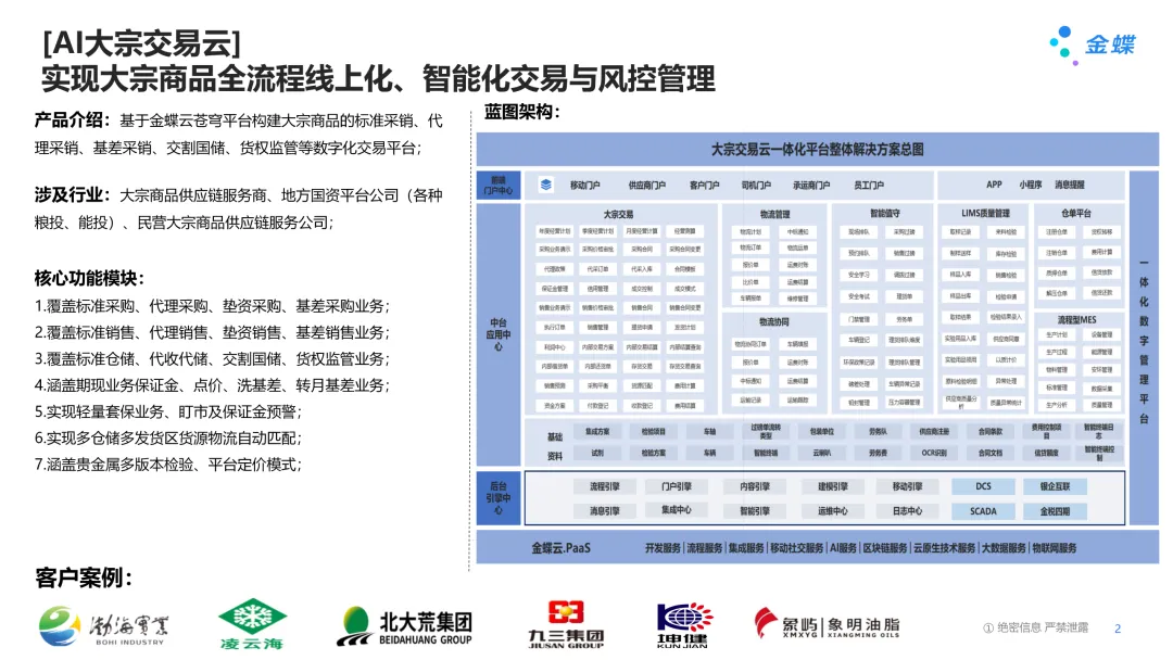 AI大宗交易云实现大宗商品全流程线上化、智能化交易与风控管理。基于金蝶云苍穹平台构建大宗商品的标准采销、代理采销、基差采销、交割国储、货权监管等数字化交易平台。