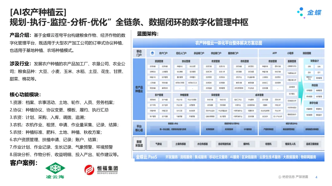 AI农产种植云是“规划—执行—监控—分析—优化”全链条、数据闭环的数字化管理中枢。基于金蝶云苍穹平台构建粮食作物、经济作物的数字化管理平台,既适用于大型农产加工公司的订单式协议种植,也适用于基地种植、农场种植模式。
