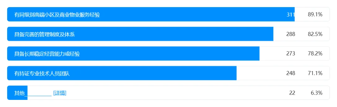 调查结果显示,业主普遍关注物业服务企业是否具备同级别项目服务经验、完善管理制度、长期稳定经营能力和专业技术团队,表明业主不仅重视物业服务企业的准入资格,更重视其持续提供高质量服务的综合能力。