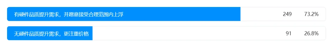 调查结果显示,有73.2%的住宅业主可以接受同等条件下在一定范围内的费用上浮以匹配更高水平硬件改善,其中选择“10%左右”上浮的占比最高。