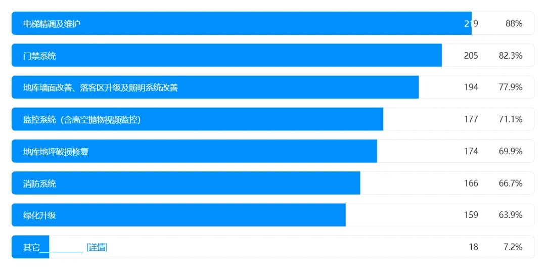 调查结果显示,住宅业主最关注的硬件设施提升重点主要集中在电梯精调及维护、门禁系统、地库环境改善、监控系统和消防系统等方面,表明业主更加重视与日常安全、出行便利和居住体验直接相关的问题。