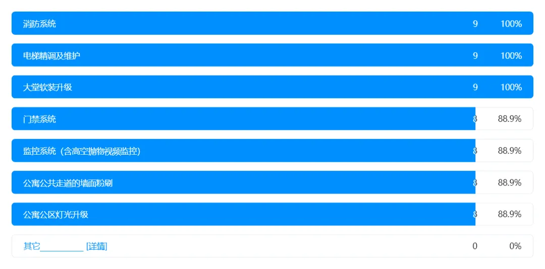 调查结果显示,当前参与调查的公寓业主最关注的硬件设施提升重点主要集中在消防系统、电梯精调及维护、大堂软装升级、门禁系统、监控系统及公区环境改善等方面,一定程度上表明公寓业主对公共空间品质和运行安全保障有较强诉求。