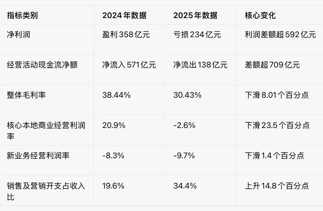 更扎心的是现金流——从2024年净流入571亿,变成2025年净流出138亿。这意味着,核心业务的造血能力,彻底逆转了。