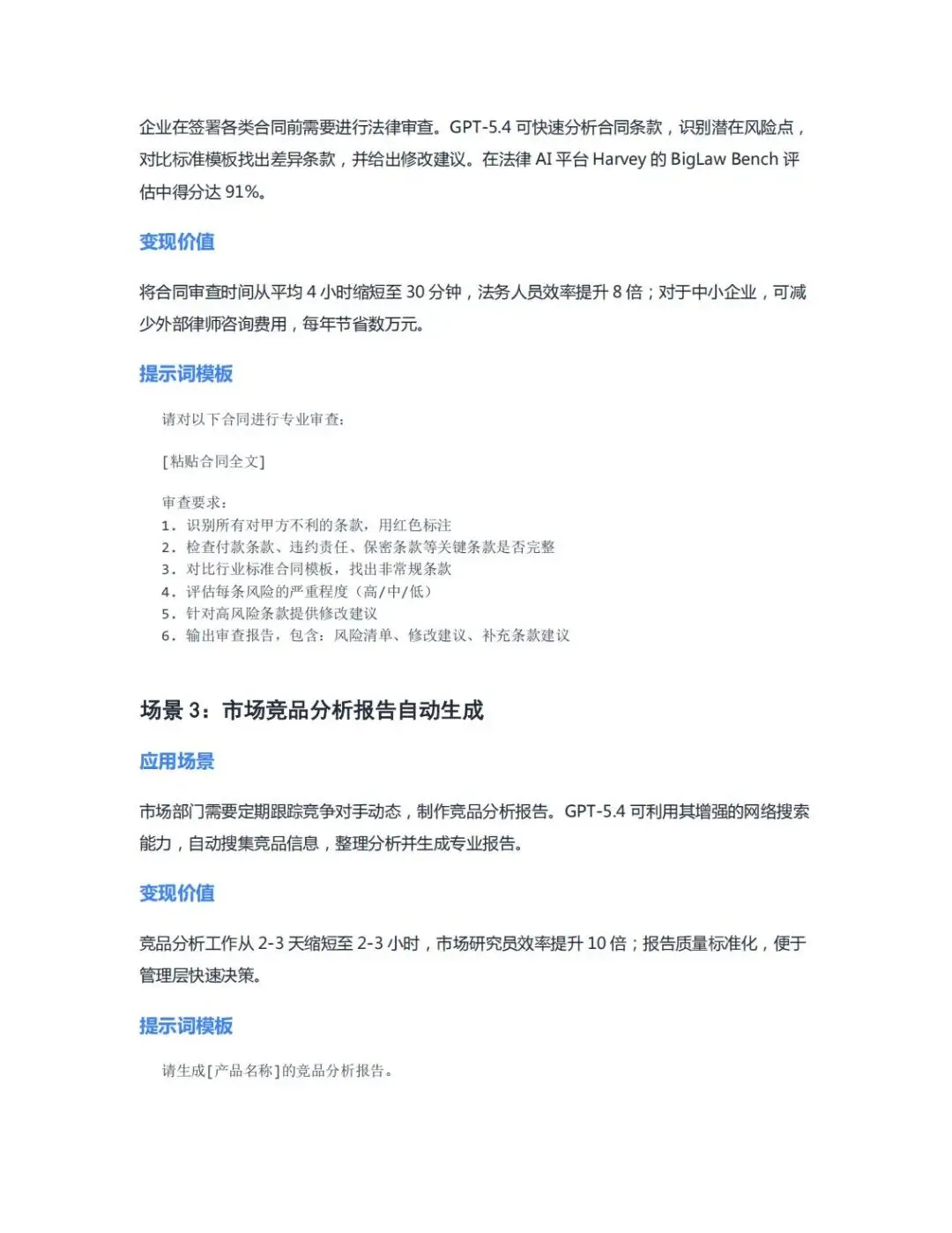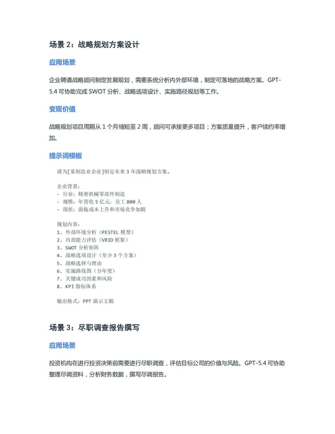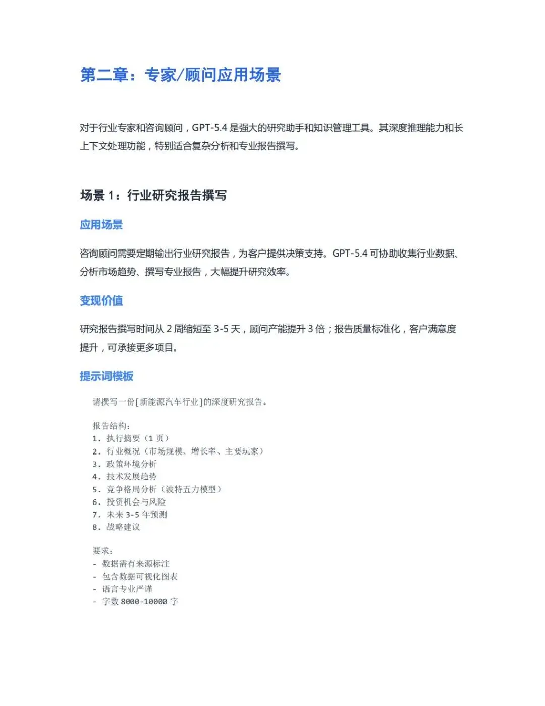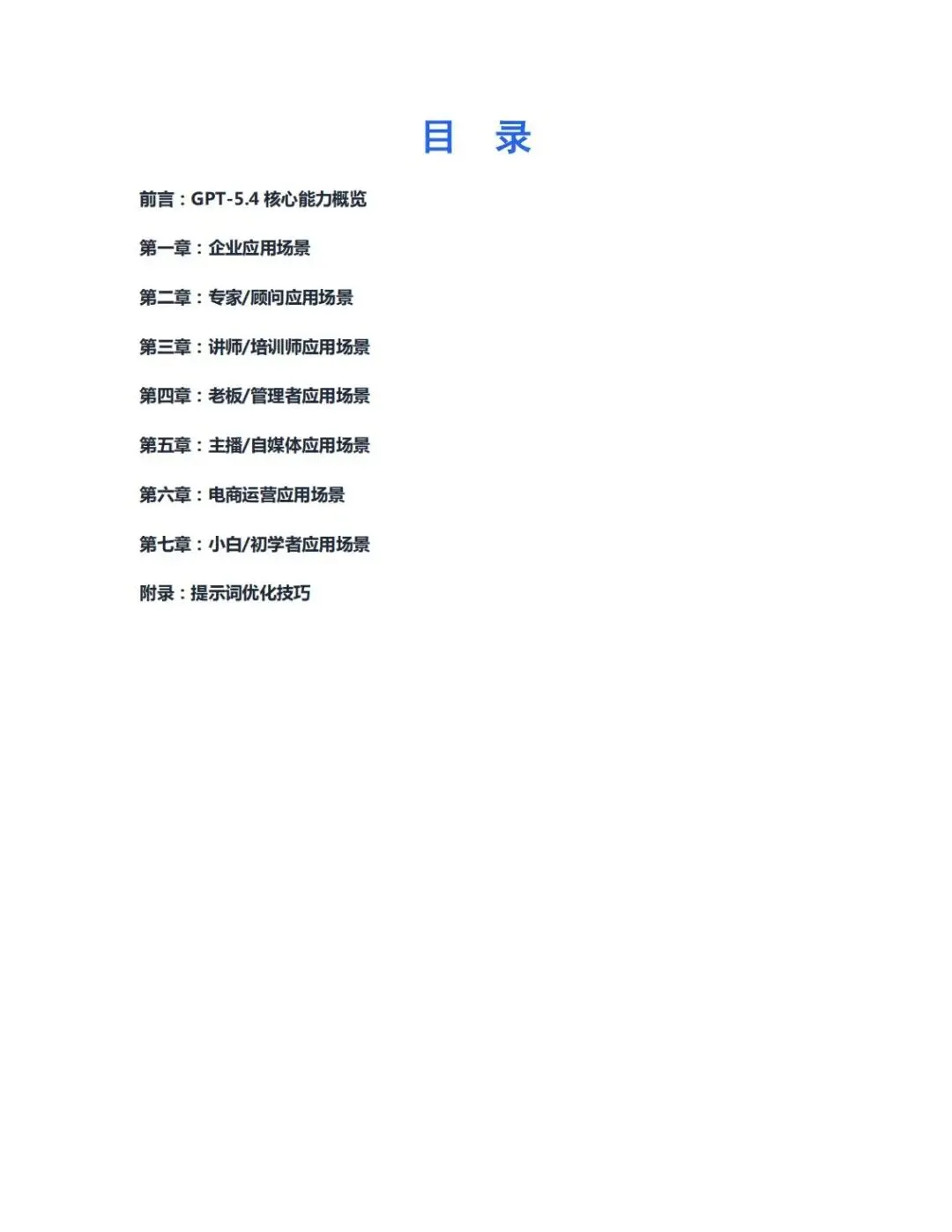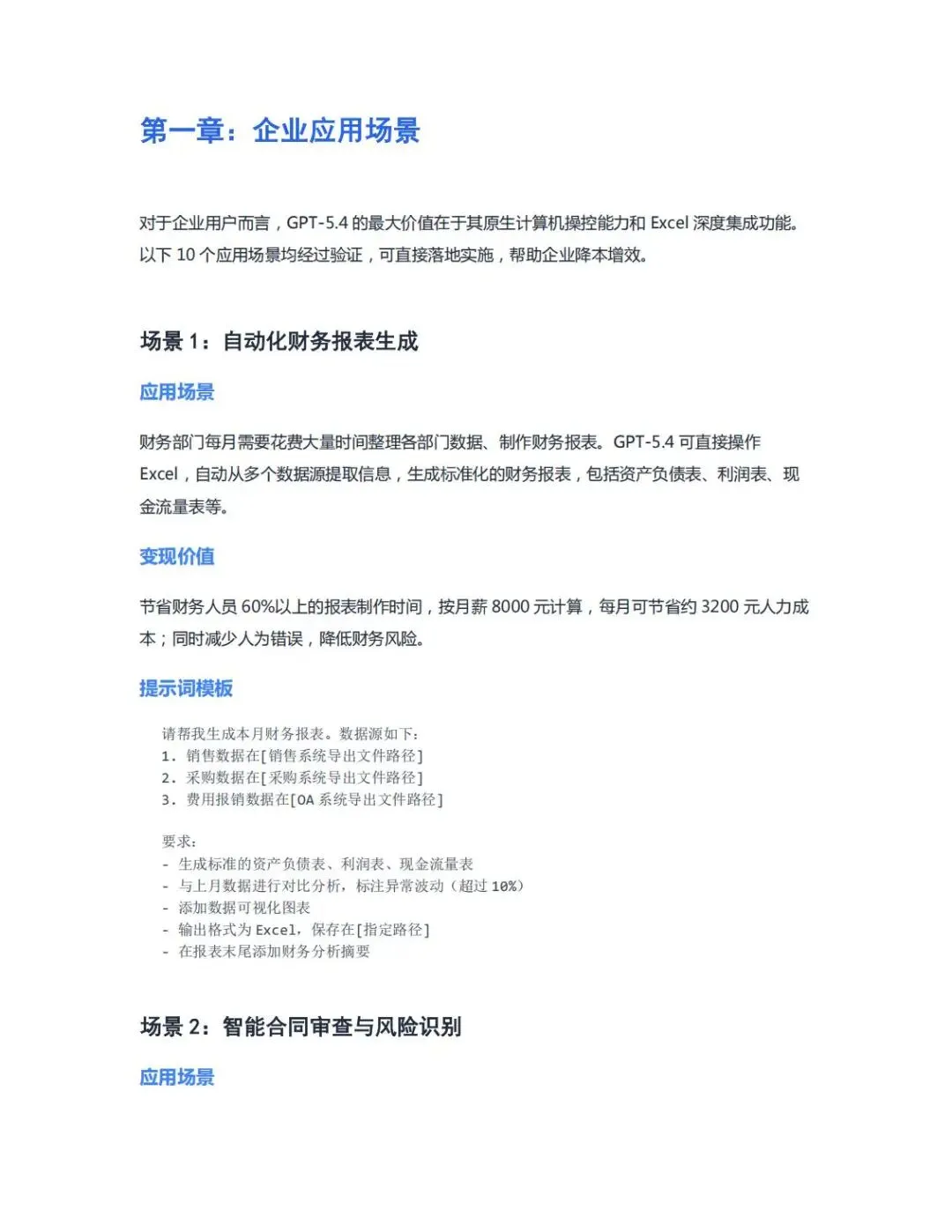 1.GPT-5.4核心能力概览:文档开篇介绍了GPT-5.4相比之前版本的关键突破,将其定位为从“对话工具”向“自动化执行代理”的转型。核心能力包括: •原生计算机操控能力:可操作软件、浏览网页、控制键鼠。 •百万Token上下文:支持处理超长文档与代码。 •Excel深度集成:在复杂表格建模与分析中表现出色。 •思考过程预览:用户可实时查看并调整模型的思考路径。 •编程能力升级:代码生成速度与复杂问题排查能力提升。 2.分角色应用场景详解:文档主体部分围绕企业、专家/顾问、讲师/培训师、老板/管理者、主播/自媒体、电商运营、小白/初学者这七类核心用户群体展开。每个章节针对一类用户,详细阐述了10个具体的高频应用场景。 3.场景结构化呈现:每个应用场景均按照统一结构说明: •应用场景:描述具体的工作痛点和GPT-5.4可介入的任务。 •变现价值:量化说明该应用可带来的效率提升、成本节约或收入增长。 •提示词模板:提供可直接使用或修改的精准提示词示例,指导用户如何与GPT-5.4交互以完成任务。 4.实用附录:文档最后提供了提示词优化技巧,包括编写原则、常用模板(如角色设定、任务分解、示例引导)以及常见问题的解决方案,帮助用户更高效地使用GPT-5.4。总而言之,这份文档是一部详尽的“说明书”和“灵感库”,旨在帮助各行各业的从业者将GPT-5.4的强大能力转化为切实的生产力工具,覆盖了从战略分析、内容创作、运营管理到个人学习的全方位需求。公号后台回复“9”,在AI大模型·领地知识星球查看~如欲查看完整版文件,请扫描下方二维码加入“AI大模型·领地”获取。说明:本文部分文字与图片资源来自于网络,分享此文是出于传递更多信息之目的,若有来源标注错误或侵犯了您的合法权益,请立即后台留言通知我们,情况属实,我们会第一时间予以删除,并同时向您表示歉意。AI大模型·资料·藏经阁
