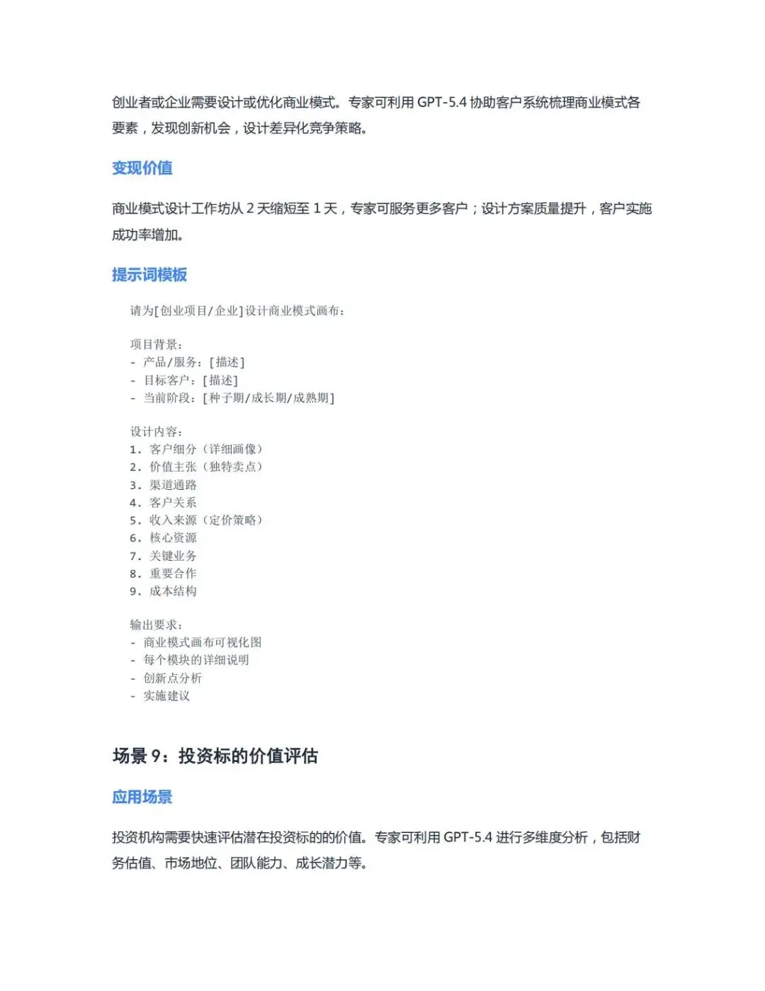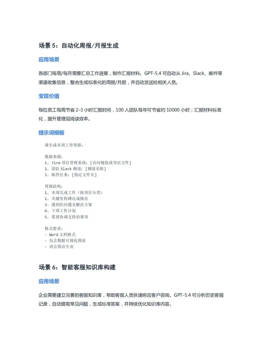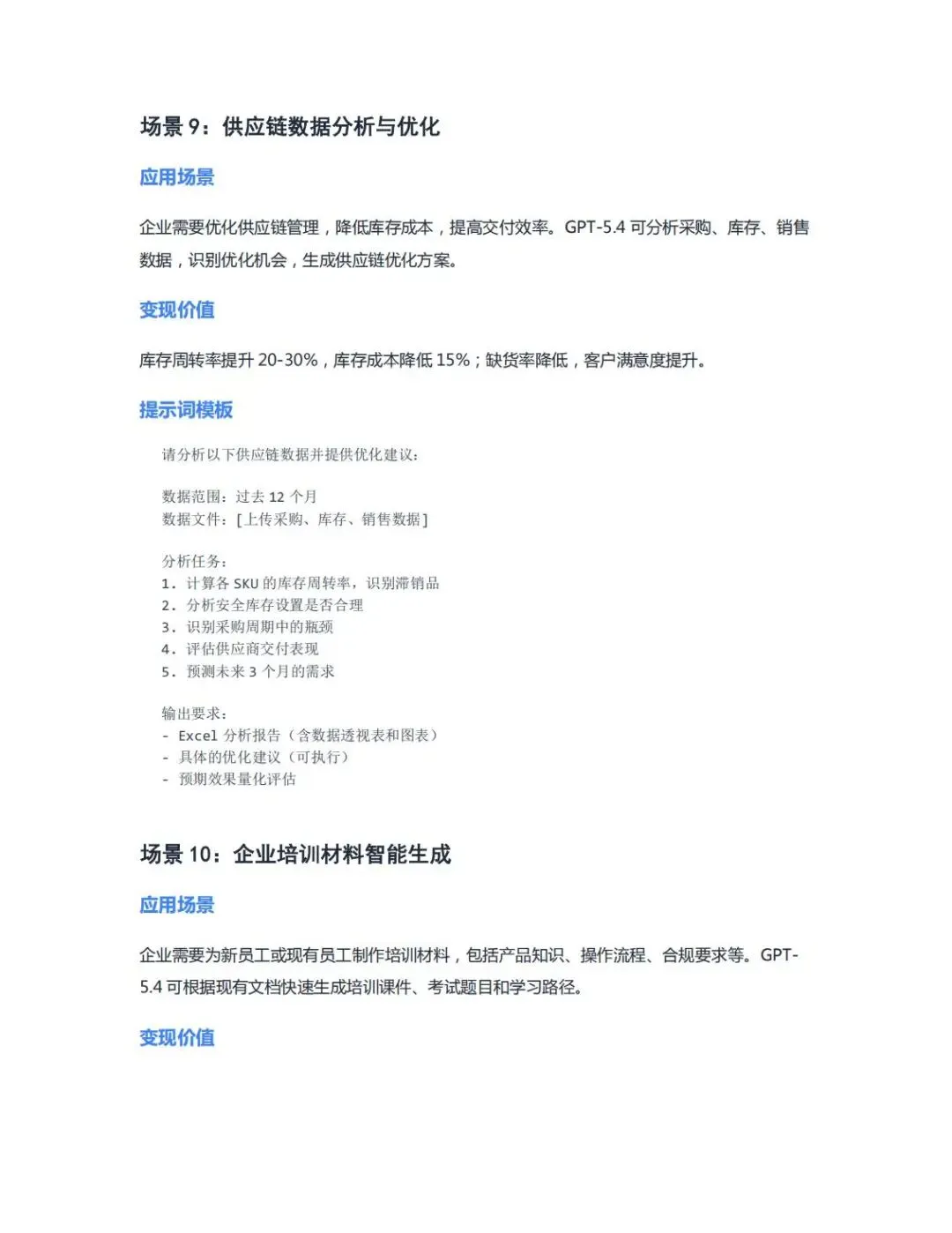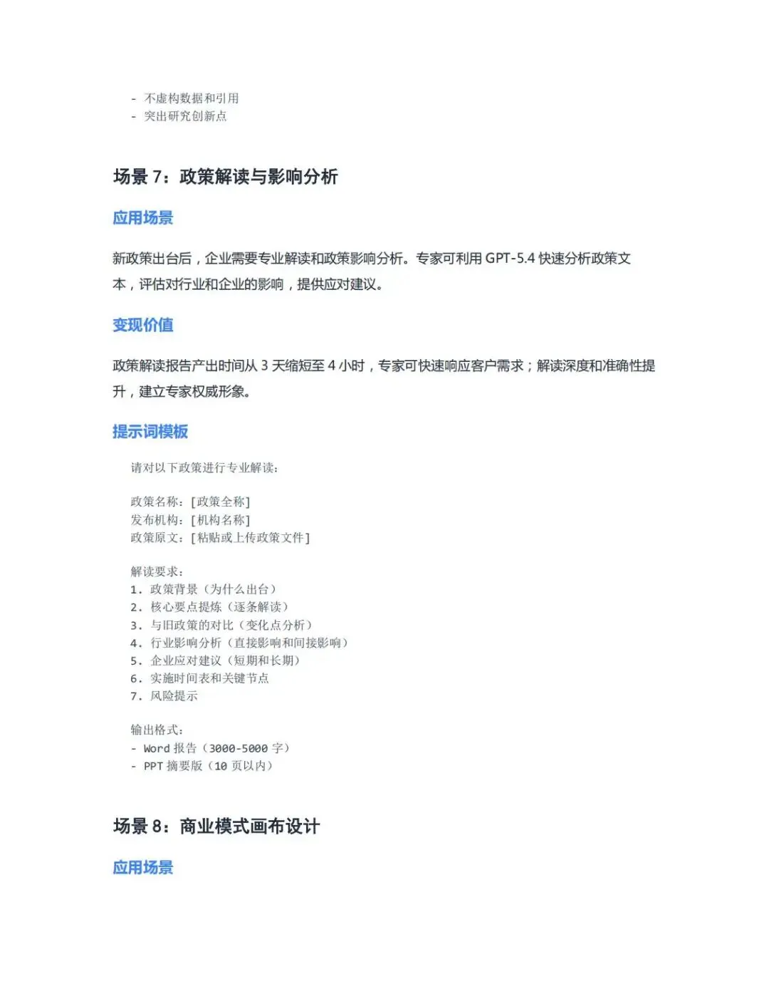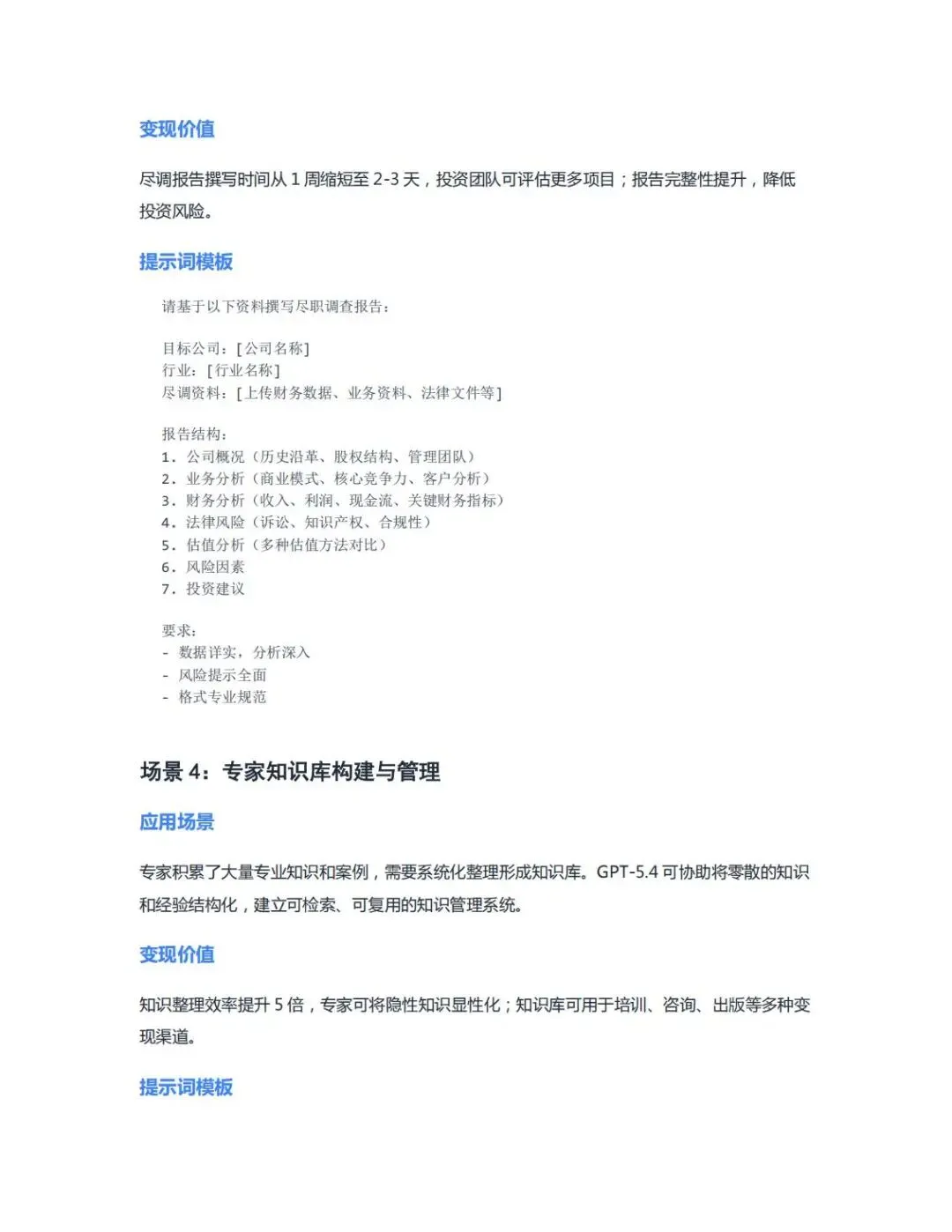 1.GPT-5.4核心能力概览:文档开篇介绍了GPT-5.4相比之前版本的关键突破,将其定位为从“对话工具”向“自动化执行代理”的转型。核心能力包括: •原生计算机操控能力:可操作软件、浏览网页、控制键鼠。 •百万Token上下文:支持处理超长文档与代码。 •Excel深度集成:在复杂表格建模与分析中表现出色。 •思考过程预览:用户可实时查看并调整模型的思考路径。 •编程能力升级:代码生成速度与复杂问题排查能力提升。 2.分角色应用场景详解:文档主体部分围绕企业、专家/顾问、讲师/培训师、老板/管理者、主播/自媒体、电商运营、小白/初学者这七类核心用户群体展开。每个章节针对一类用户,详细阐述了10个具体的高频应用场景。 3.场景结构化呈现:每个应用场景均按照统一结构说明: •应用场景:描述具体的工作痛点和GPT-5.4可介入的任务。 •变现价值:量化说明该应用可带来的效率提升、成本节约或收入增长。 •提示词模板:提供可直接使用或修改的精准提示词示例,指导用户如何与GPT-5.4交互以完成任务。 4.实用附录:文档最后提供了提示词优化技巧,包括编写原则、常用模板(如角色设定、任务分解、示例引导)以及常见问题的解决方案,帮助用户更高效地使用GPT-5.4。总而言之,这份文档是一部详尽的“说明书”和“灵感库”,旨在帮助各行各业的从业者将GPT-5.4的强大能力转化为切实的生产力工具,覆盖了从战略分析、内容创作、运营管理到个人学习的全方位需求。公号后台回复“9”,在AI大模型·领地知识星球查看~如欲查看完整版文件,请扫描下方二维码加入“AI大模型·领地”获取。说明:本文部分文字与图片资源来自于网络,分享此文是出于传递更多信息之目的,若有来源标注错误或侵犯了您的合法权益,请立即后台留言通知我们,情况属实,我们会第一时间予以删除,并同时向您表示歉意。AI大模型·资料·藏经阁