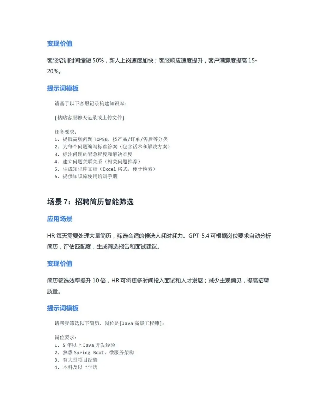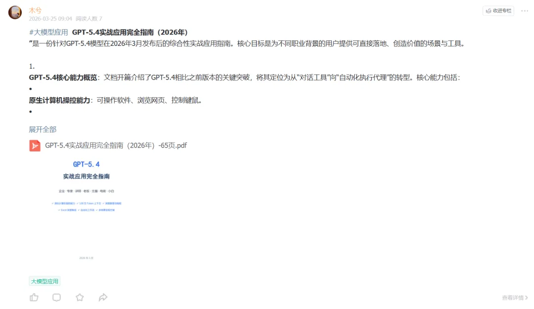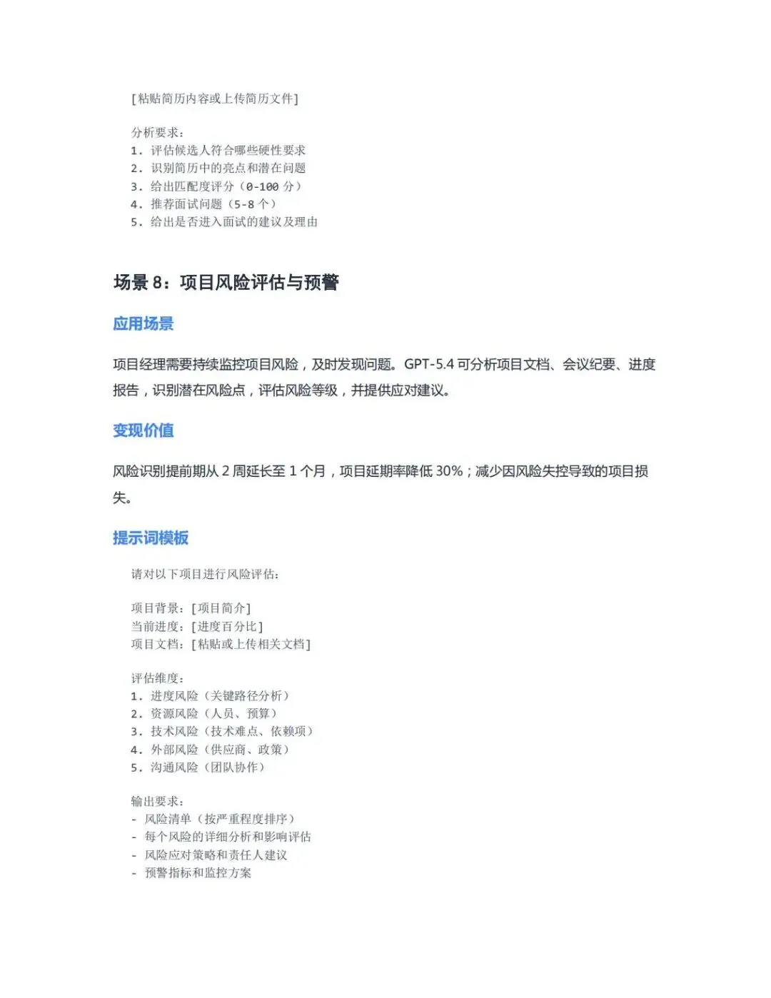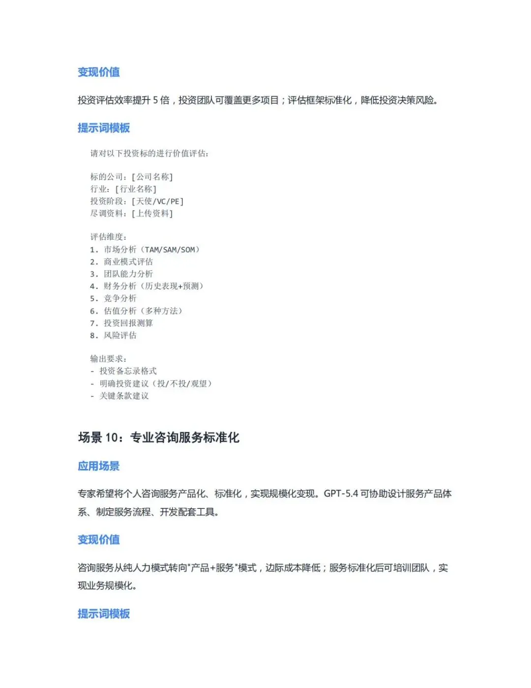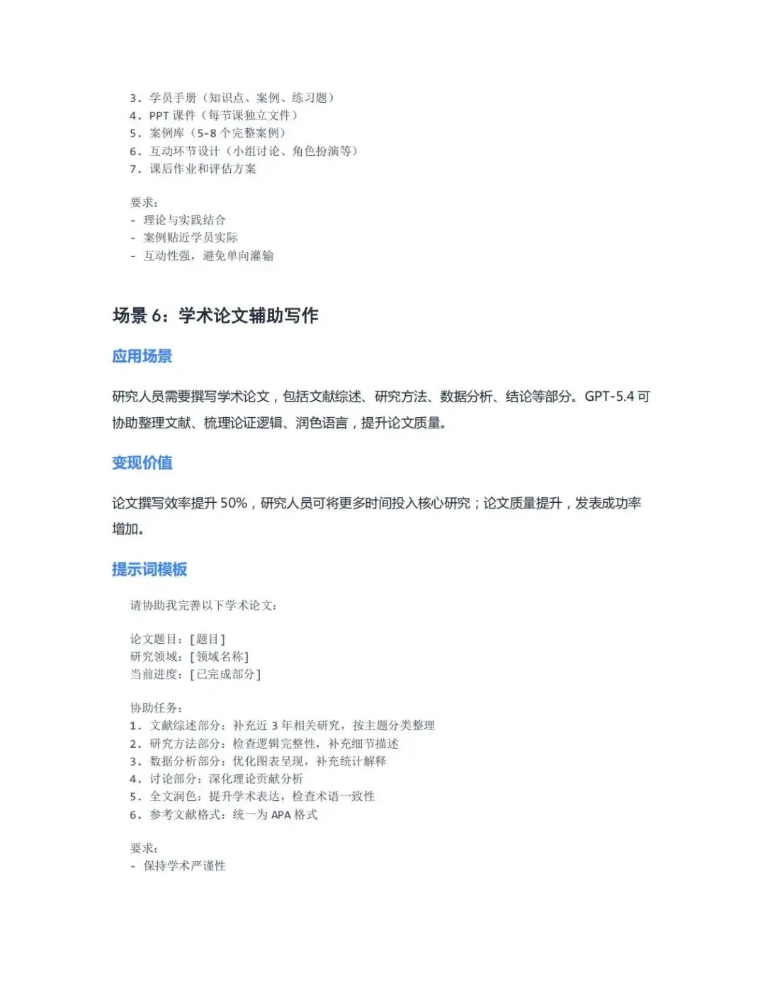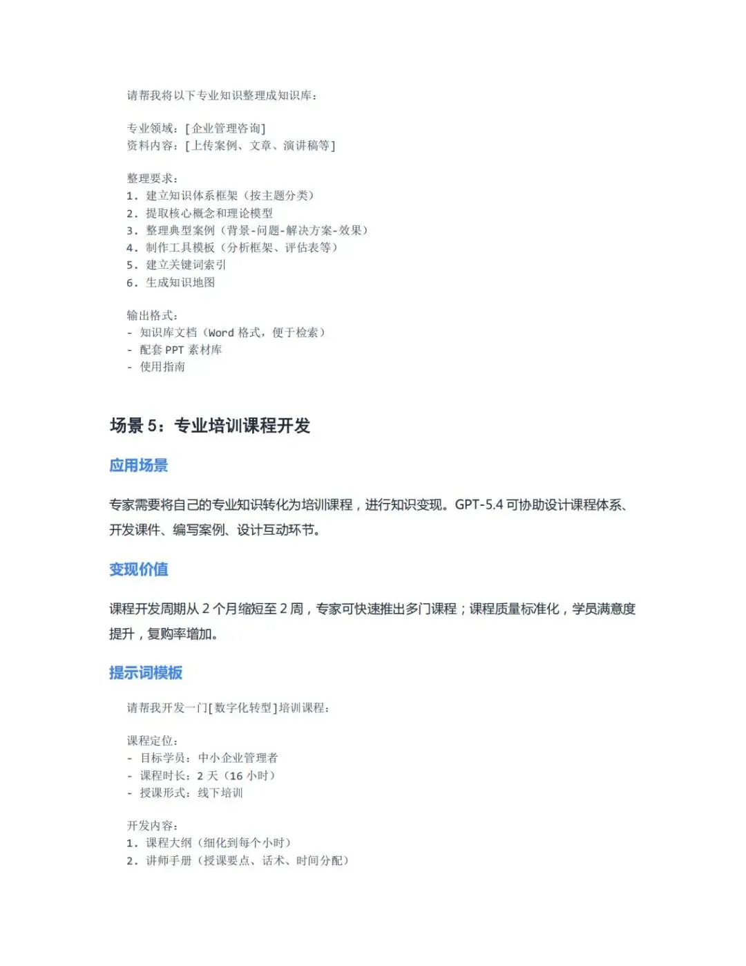 1.GPT-5.4核心能力概览:文档开篇介绍了GPT-5.4相比之前版本的关键突破,将其定位为从“对话工具”向“自动化执行代理”的转型。核心能力包括: •原生计算机操控能力:可操作软件、浏览网页、控制键鼠。 •百万Token上下文:支持处理超长文档与代码。 •Excel深度集成:在复杂表格建模与分析中表现出色。 •思考过程预览:用户可实时查看并调整模型的思考路径。 •编程能力升级:代码生成速度与复杂问题排查能力提升。 2.分角色应用场景详解:文档主体部分围绕企业、专家/顾问、讲师/培训师、老板/管理者、主播/自媒体、电商运营、小白/初学者这七类核心用户群体展开。每个章节针对一类用户,详细阐述了10个具体的高频应用场景。 3.场景结构化呈现:每个应用场景均按照统一结构说明: •应用场景:描述具体的工作痛点和GPT-5.4可介入的任务。 •变现价值:量化说明该应用可带来的效率提升、成本节约或收入增长。 •提示词模板:提供可直接使用或修改的精准提示词示例,指导用户如何与GPT-5.4交互以完成任务。 4.实用附录:文档最后提供了提示词优化技巧,包括编写原则、常用模板(如角色设定、任务分解、示例引导)以及常见问题的解决方案,帮助用户更高效地使用GPT-5.4。总而言之,这份文档是一部详尽的“说明书”和“灵感库”,旨在帮助各行各业的从业者将GPT-5.4的强大能力转化为切实的生产力工具,覆盖了从战略分析、内容创作、运营管理到个人学习的全方位需求。公号后台回复“9”,在AI大模型·领地知识星球查看~如欲查看完整版文件,请扫描下方二维码加入“AI大模型·领地”获取。说明:本文部分文字与图片资源来自于网络,分享此文是出于传递更多信息之目的,若有来源标注错误或侵犯了您的合法权益,请立即后台留言通知我们,情况属实,我们会第一时间予以删除,并同时向您表示歉意。AI大模型·资料·藏经阁