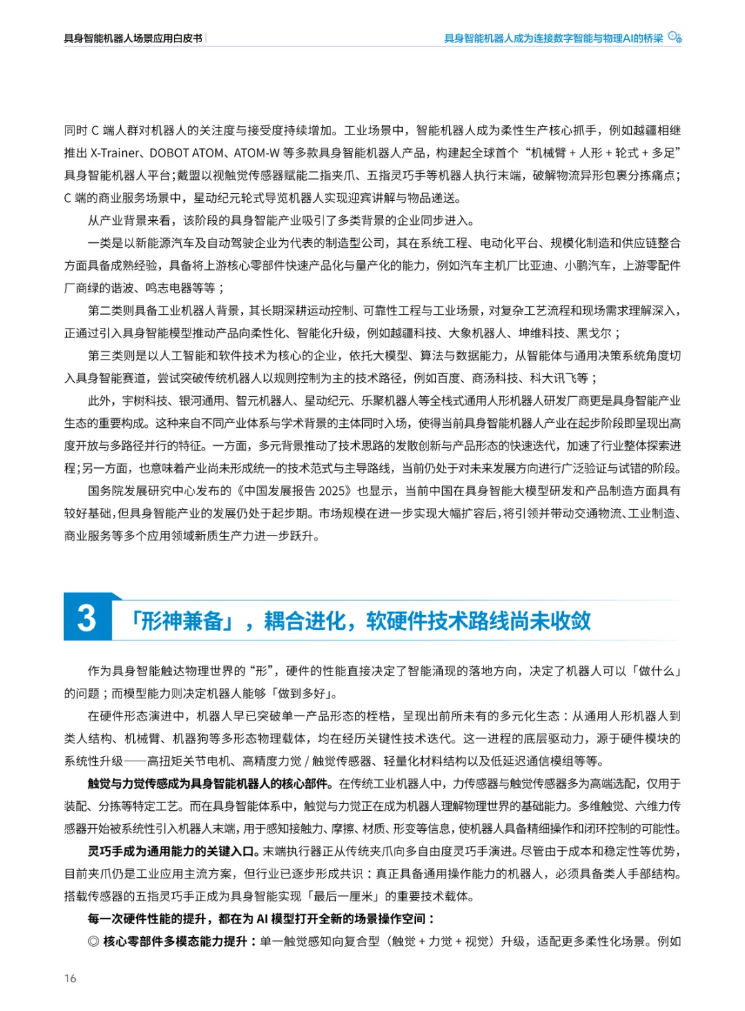 发展阶段:产业正处于 “小批量落地与‘百花齐放’的集体探索阶段” 。技术路径(VLA模型、世界模型、Sim2Real等)高度分化,尚未收敛;产业链分工细化,来自新能源汽车、传统工业机器人、人工智能等多源背景的企业同步入场。