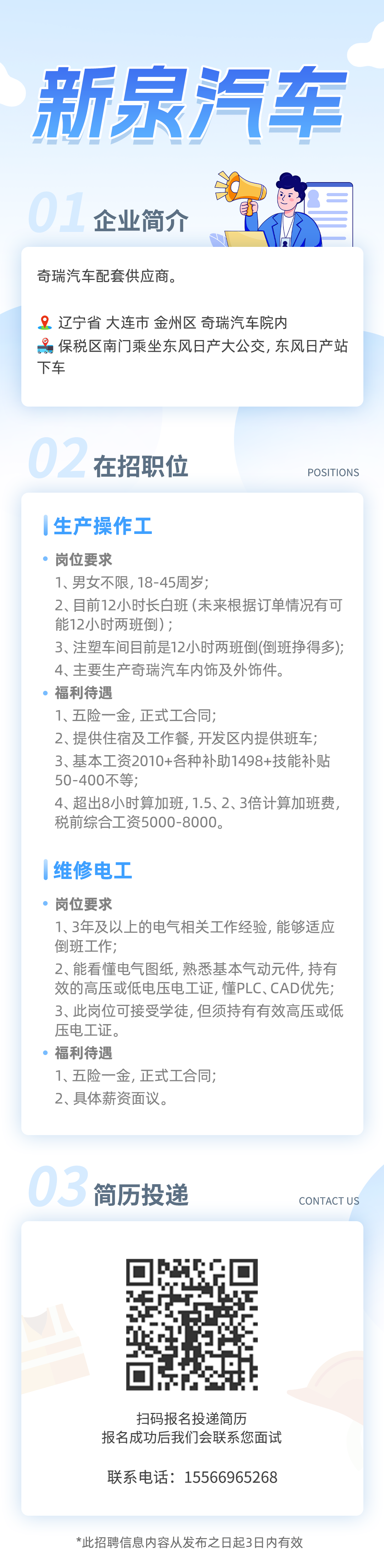【新泉汽车】招聘操作工、维修电工,正式工合同,五险一金,综合工资5000-8000.