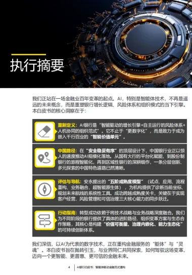 本白皮书系统勾勒了 AI 银行的演进蓝图与实践路径,核心逻辑在于以智能体为核心重构金融服务模式,通过成熟度评估精准定位转型坐标,依托 “价值引领、生态共筑、治理护航” 原则稳步推进。中国银行业正凭借丰富场景与政策支持,从 “模式学习者” 向 “范式定义者” 转变,未来竞争的关键将是构建以可信为基石、智能体为枢纽、开放平台为支撑的金融新生态,实现技术潜能向客户信任与商业价值的高效转化。