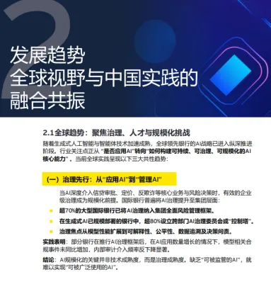 全球三大趋势:治理先行,超 70% 大型国际银行将 AI 治理纳入全面风险管理;人才重构,高回报银行业务背景人员占 AI 团队 40-50%;规模化跨越,通过统一平台与运营机制突破试点瓶颈。