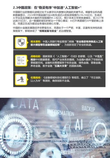中国政策导向:以 “安全稳妥有序” 为原则,依托《“人工智能 +” 行动》等政策,北京、上海、深圳等地因地制宜打造 AI 金融创新试验田。