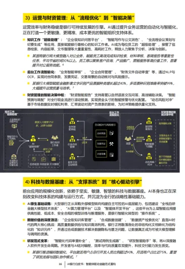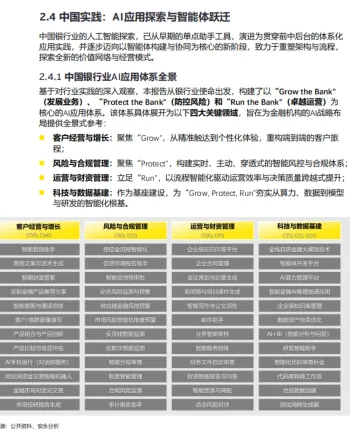 中国实践全景:构建 “客户经营、风险合规、运营财资、科技数据基建” 四大应用体系,从单点工具应用迈向多智能体协同的 “AI 原生” 新阶段。
