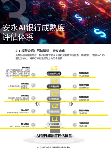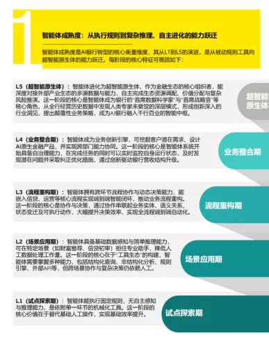 五阶演进模型:L1 试点探索期(被动工具)、L2 场景应用期(专业助手)、L3 流程重构期(流程协作者)、L4 业务整合期(业务驱动者)、L5 超智能原生体(生态组织者)。