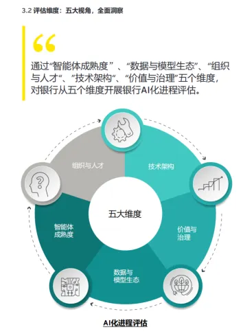 五大评估维度:涵盖智能体成熟度、数据与模型生态、组织与人才、技术架构、价值与治理,全面衡量银行 AI 化进程。