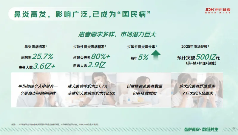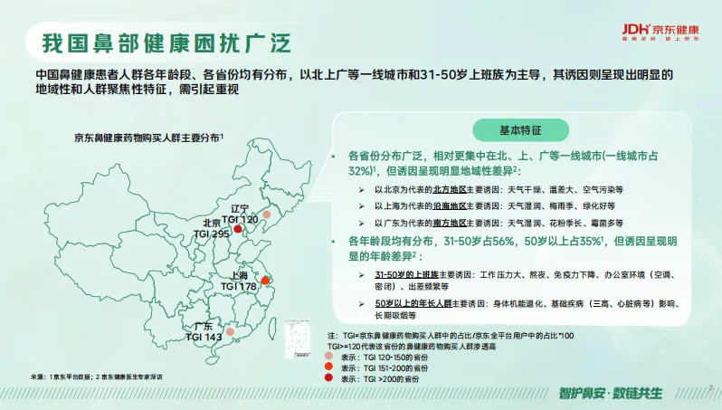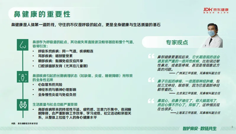 《京东健康鼻健康线上消费洞察报告2026》基于平台、行业数据及用户调研、专家深访,剖析了国民鼻健康消费现状与市场趋势,并给出行业应对方案。我国鼻健康问题突出,鼻炎患者达3.6亿,过敏性鼻炎占比超80%且年增5%,2025年鼻健康市场规模预计破500亿元,鼻健康已从局部不适演变为影响全身健康与生活质量的重要议题,其诱因呈现明显的地域、年龄差异,且鼻部疾病易引发呼吸、耳部、眼部等多器官并发症,还会影响心血管、神经系统等。