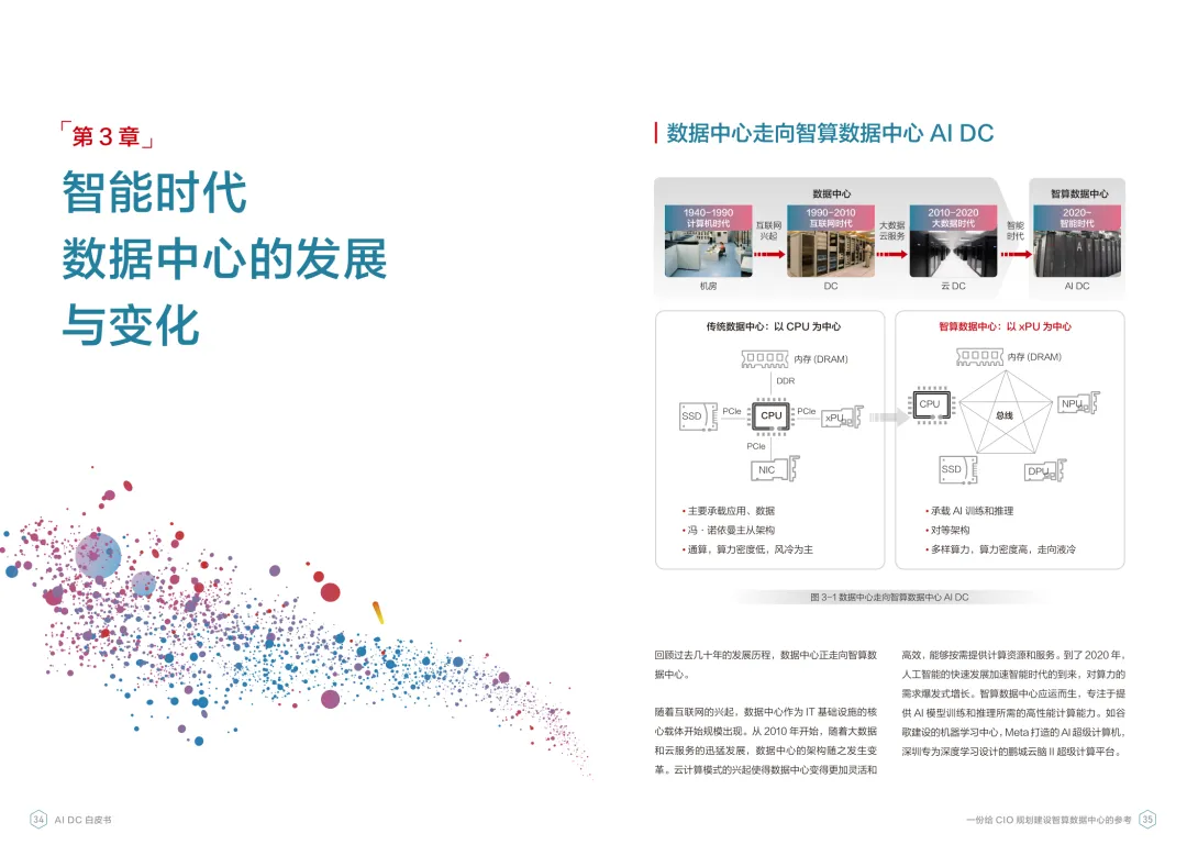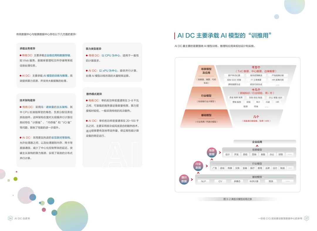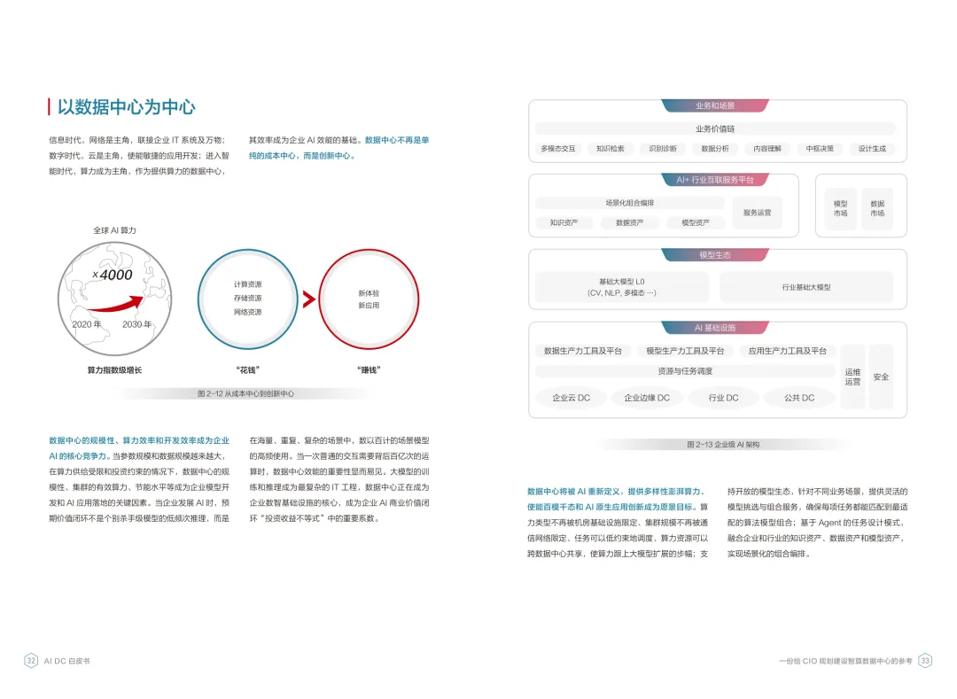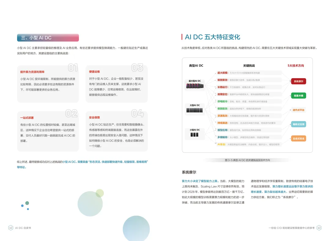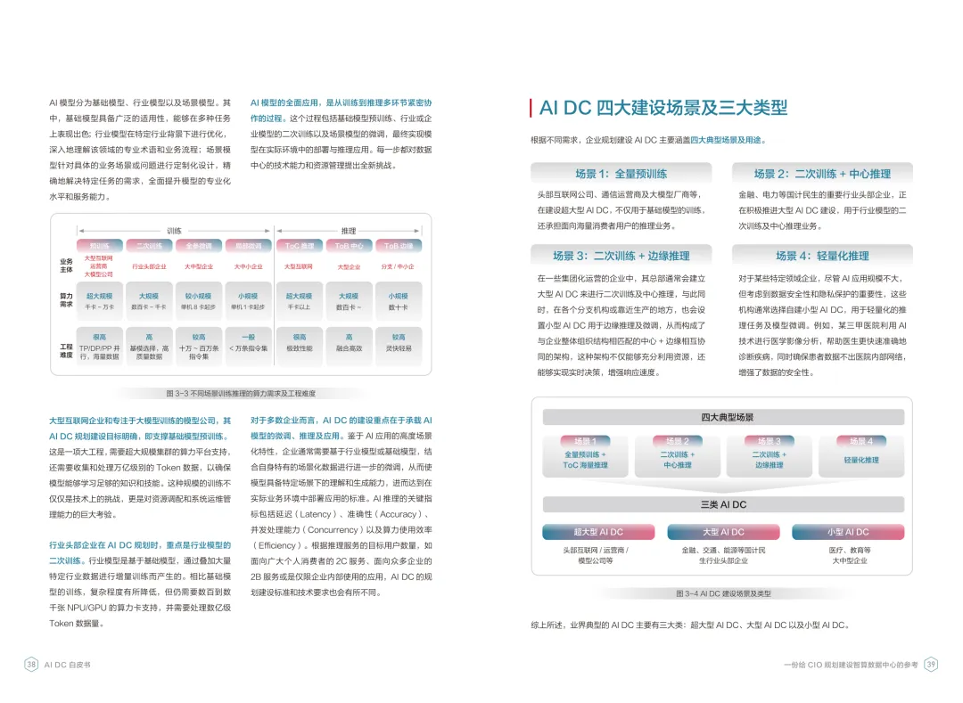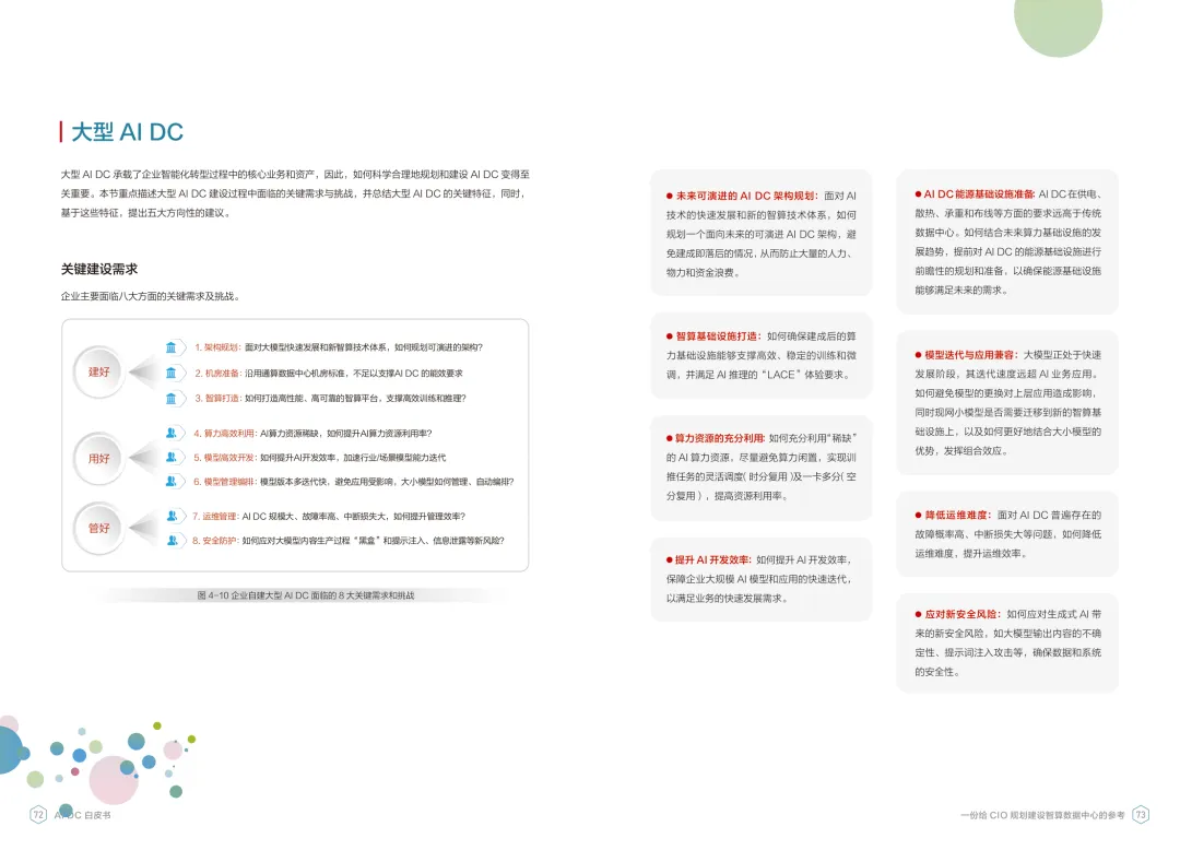 导读:报告聚焦智算数据中心建设,为企业 CIO 提供规划参考。随着 AI 成为不可逆转的趋势,算力已成为核心生产要素,传统数据中心难以满足 AI 训练与推理的高性能需求,智算数据中心(AI DC)应运而生,实现从成本中心向创新中心的转型。AI DC 与传统数据中心存在本质差异,采用全互联对等架构,以 xPU 为核心提供并行计算,单机柜功率密度显著提升,需液冷等高效散热技术支撑。其建设分为超大型、大型、小型三类,分别对应基础模型预训练、行业模型二次训练、轻量化推理等场景,核心特征涵盖系统摩尔、能基木桶、迭代式平台等五大维度。白皮书提出四大建设倡议,强调适度超前布局、集约化绿色发展、共建开放生态及筑牢解决方案、生态、人才三大底座。通过算存网协同优化、弹性能源配置、全链路安全防护等技术创新,AI DC 将为千行万业智能化转型提供坚实算力支撑,推动智能经济持续增长。