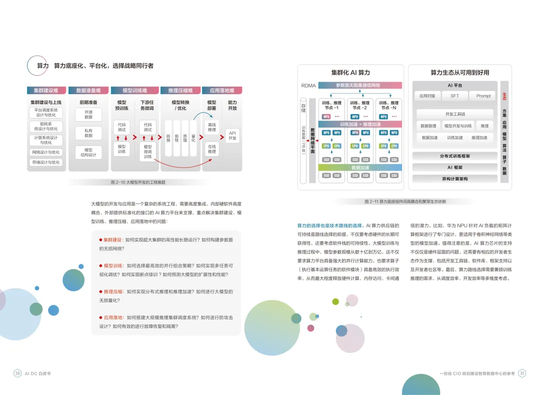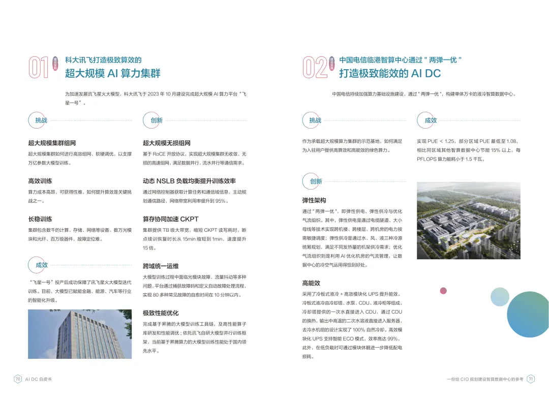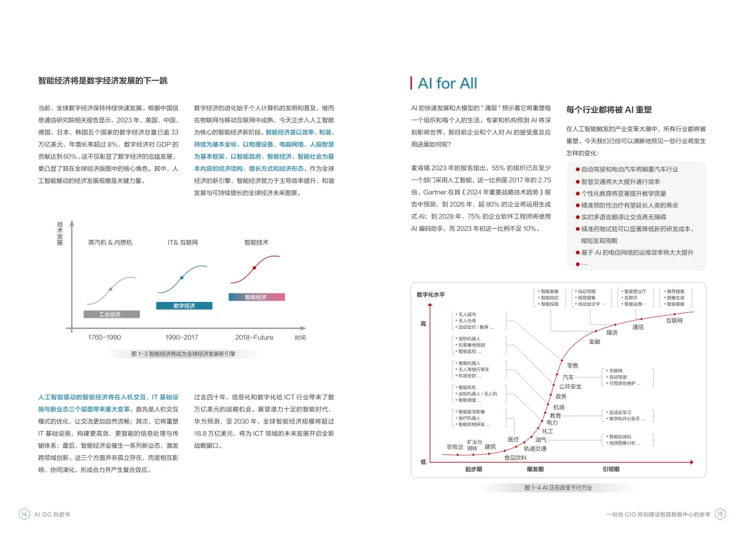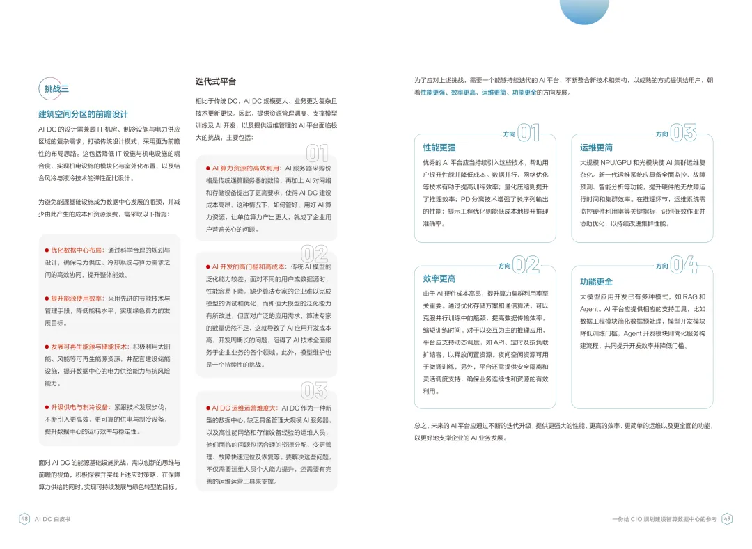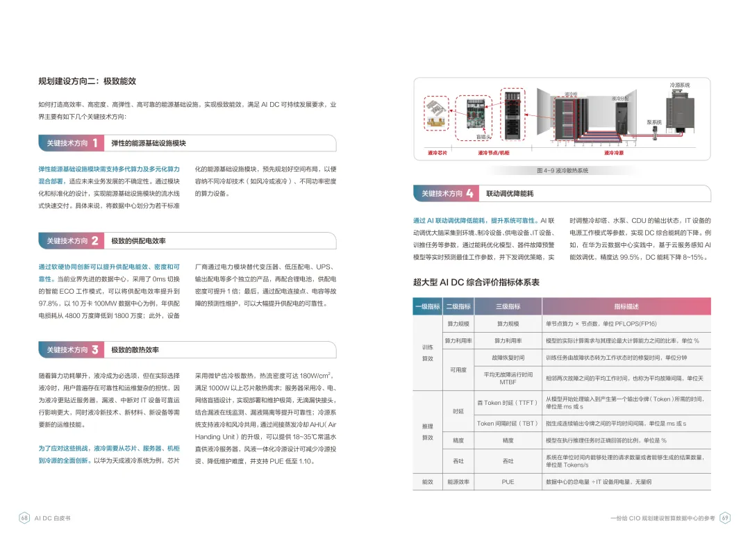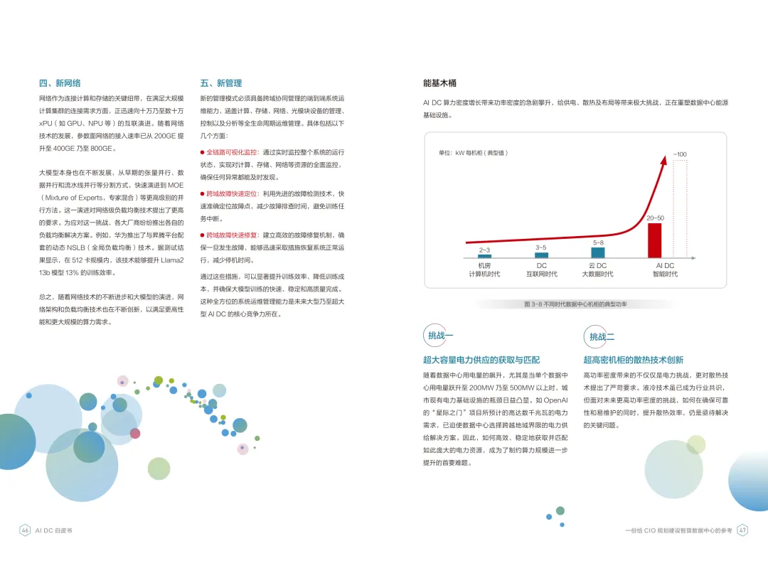 导读:报告聚焦智算数据中心建设,为企业 CIO 提供规划参考。随着 AI 成为不可逆转的趋势,算力已成为核心生产要素,传统数据中心难以满足 AI 训练与推理的高性能需求,智算数据中心(AI DC)应运而生,实现从成本中心向创新中心的转型。AI DC 与传统数据中心存在本质差异,采用全互联对等架构,以 xPU 为核心提供并行计算,单机柜功率密度显著提升,需液冷等高效散热技术支撑。其建设分为超大型、大型、小型三类,分别对应基础模型预训练、行业模型二次训练、轻量化推理等场景,核心特征涵盖系统摩尔、能基木桶、迭代式平台等五大维度。白皮书提出四大建设倡议,强调适度超前布局、集约化绿色发展、共建开放生态及筑牢解决方案、生态、人才三大底座。通过算存网协同优化、弹性能源配置、全链路安全防护等技术创新,AI DC 将为千行万业智能化转型提供坚实算力支撑,推动智能经济持续增长。
