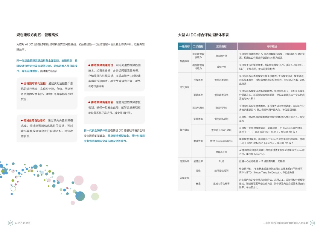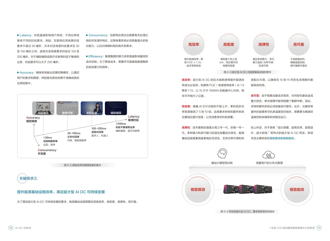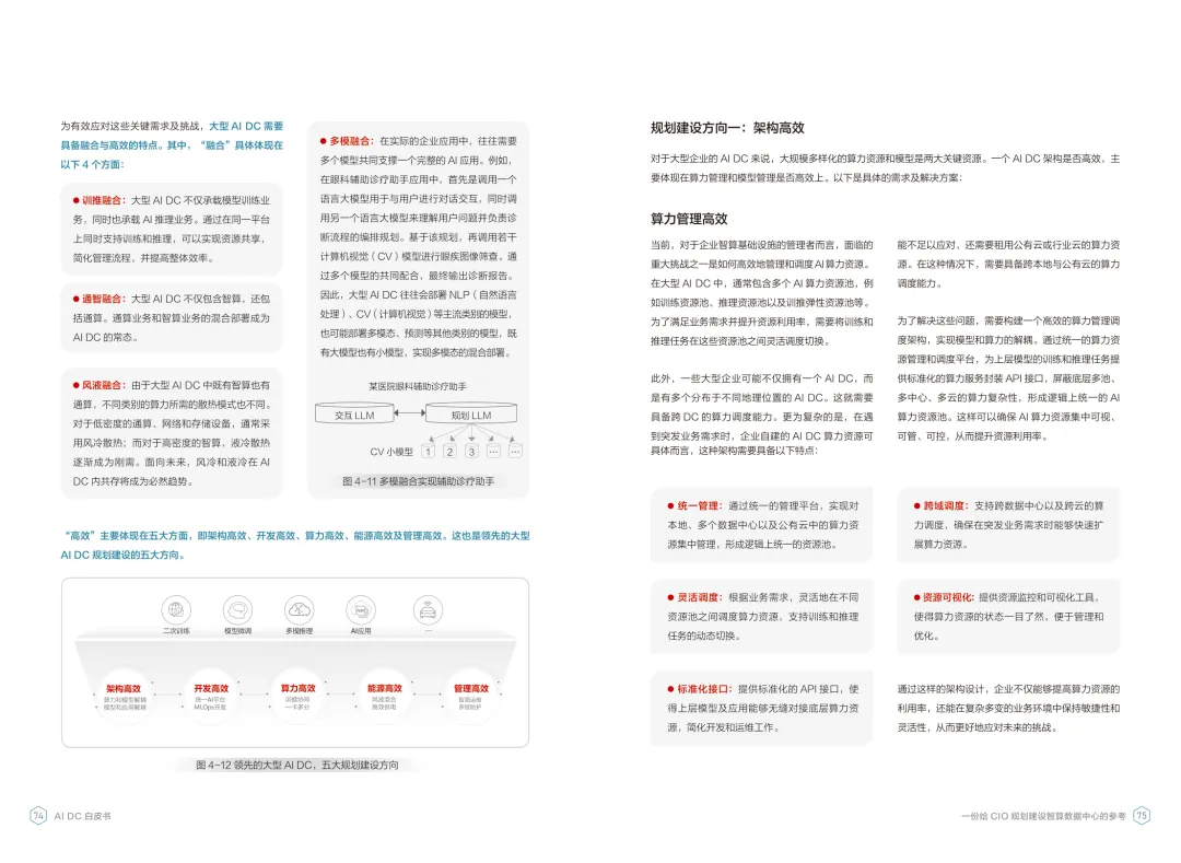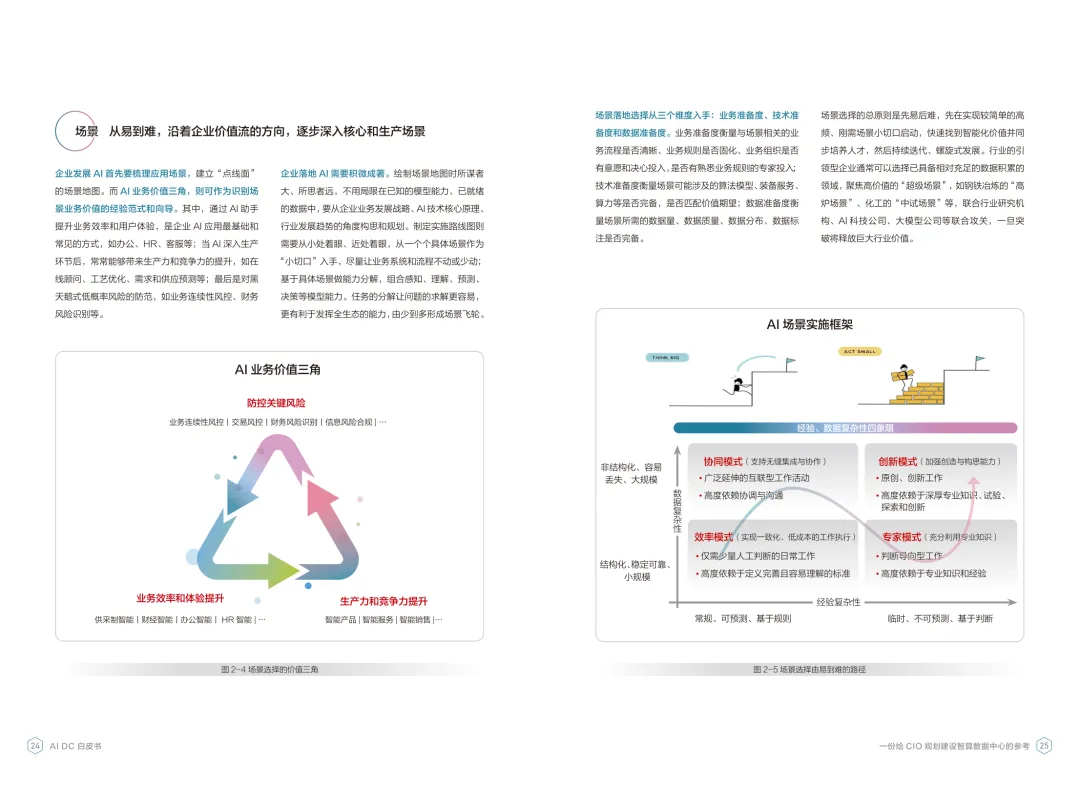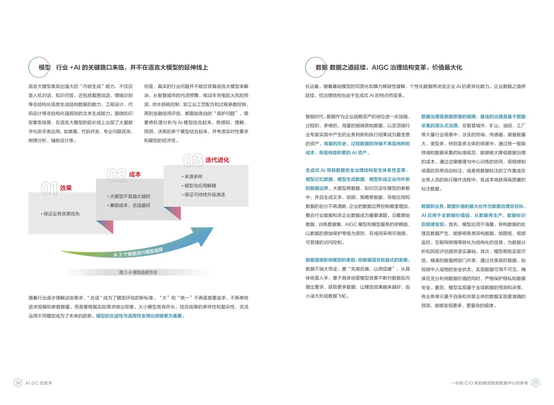 导读:报告聚焦智算数据中心建设,为企业 CIO 提供规划参考。随着 AI 成为不可逆转的趋势,算力已成为核心生产要素,传统数据中心难以满足 AI 训练与推理的高性能需求,智算数据中心(AI DC)应运而生,实现从成本中心向创新中心的转型。AI DC 与传统数据中心存在本质差异,采用全互联对等架构,以 xPU 为核心提供并行计算,单机柜功率密度显著提升,需液冷等高效散热技术支撑。其建设分为超大型、大型、小型三类,分别对应基础模型预训练、行业模型二次训练、轻量化推理等场景,核心特征涵盖系统摩尔、能基木桶、迭代式平台等五大维度。白皮书提出四大建设倡议,强调适度超前布局、集约化绿色发展、共建开放生态及筑牢解决方案、生态、人才三大底座。通过算存网协同优化、弹性能源配置、全链路安全防护等技术创新,AI DC 将为千行万业智能化转型提供坚实算力支撑,推动智能经济持续增长。