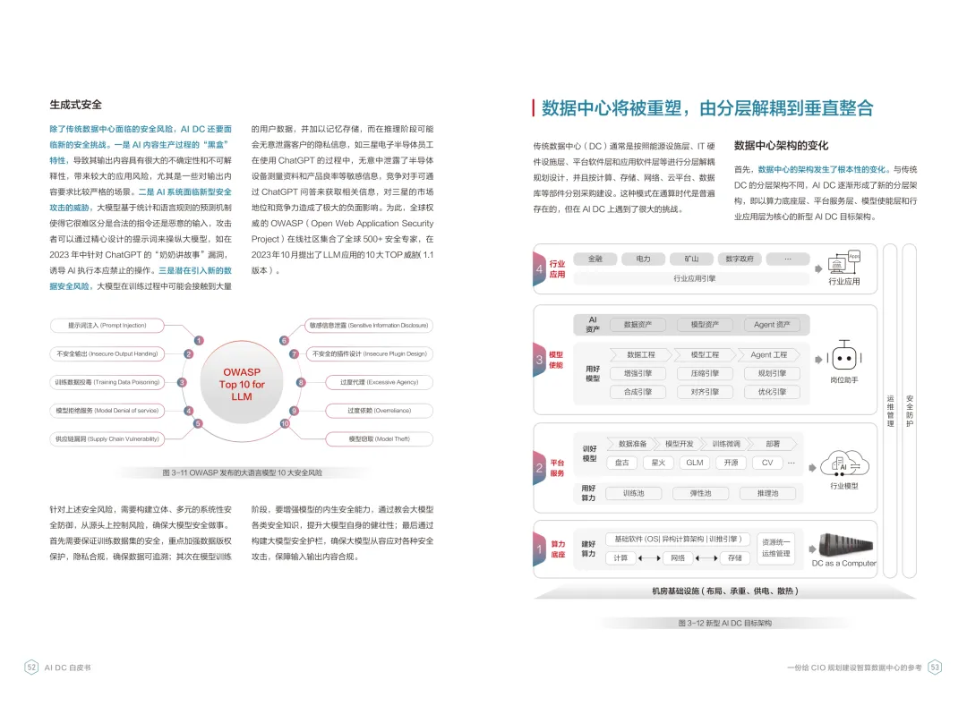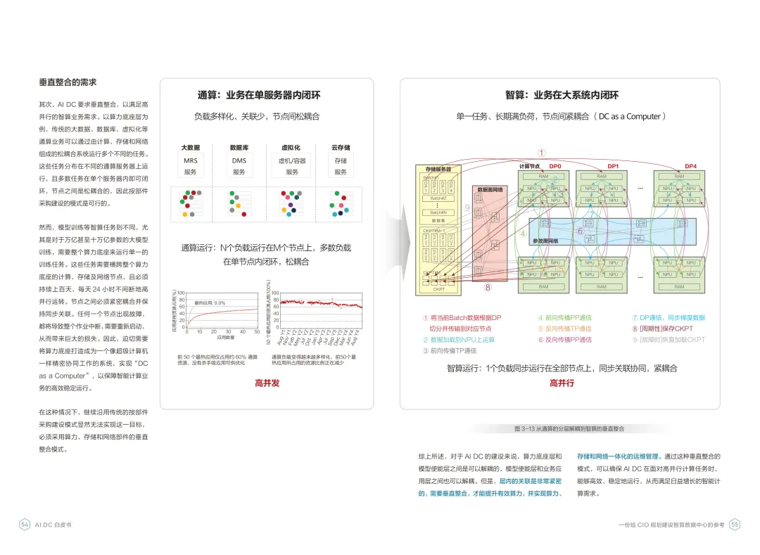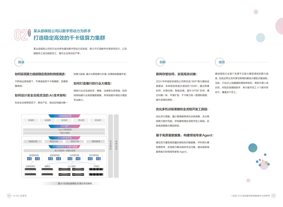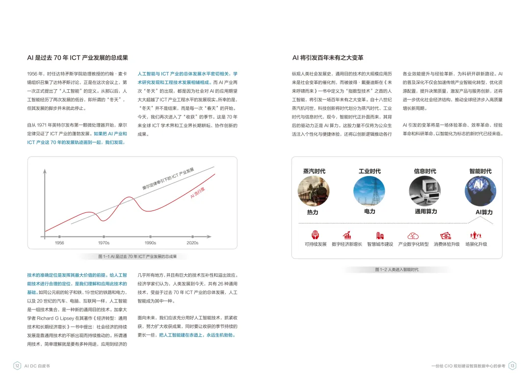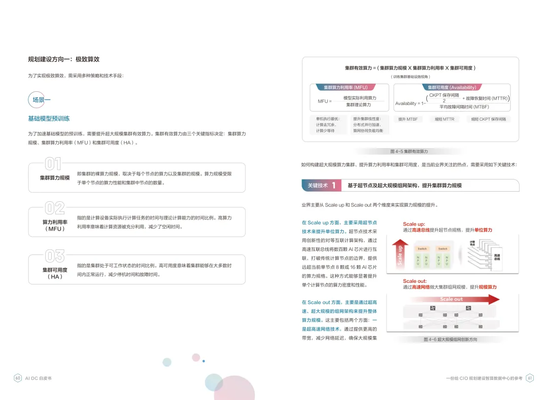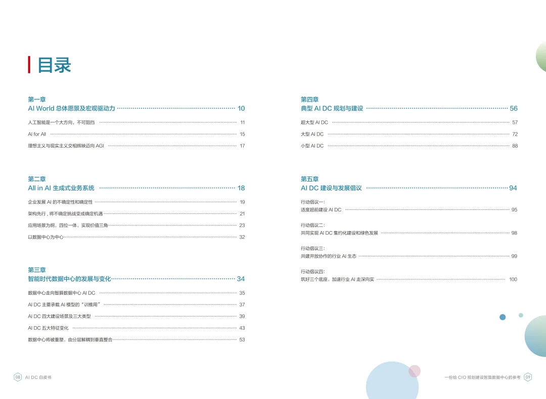 导读:报告聚焦智算数据中心建设,为企业 CIO 提供规划参考。随着 AI 成为不可逆转的趋势,算力已成为核心生产要素,传统数据中心难以满足 AI 训练与推理的高性能需求,智算数据中心(AI DC)应运而生,实现从成本中心向创新中心的转型。AI DC 与传统数据中心存在本质差异,采用全互联对等架构,以 xPU 为核心提供并行计算,单机柜功率密度显著提升,需液冷等高效散热技术支撑。其建设分为超大型、大型、小型三类,分别对应基础模型预训练、行业模型二次训练、轻量化推理等场景,核心特征涵盖系统摩尔、能基木桶、迭代式平台等五大维度。白皮书提出四大建设倡议,强调适度超前布局、集约化绿色发展、共建开放生态及筑牢解决方案、生态、人才三大底座。通过算存网协同优化、弹性能源配置、全链路安全防护等技术创新,AI DC 将为千行万业智能化转型提供坚实算力支撑,推动智能经济持续增长。