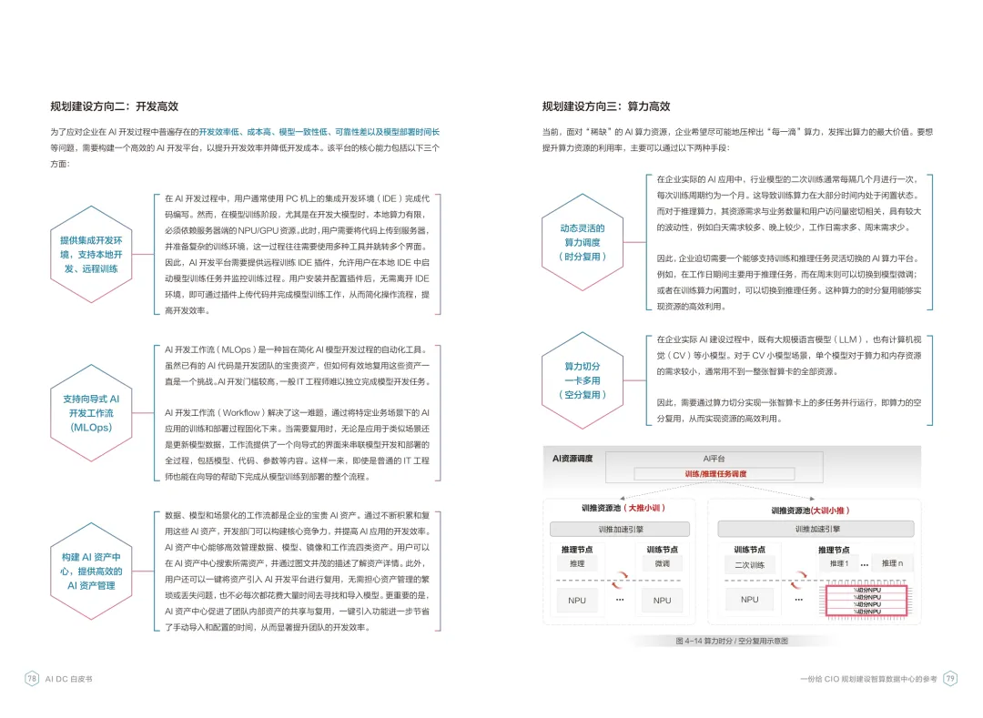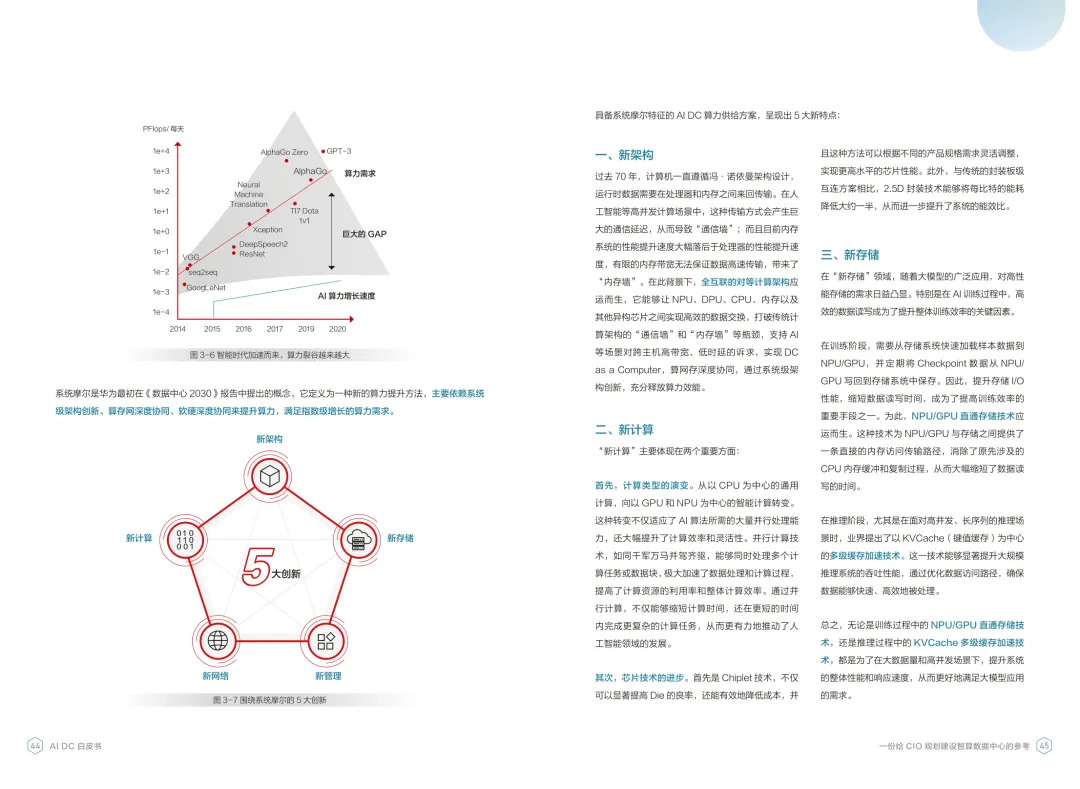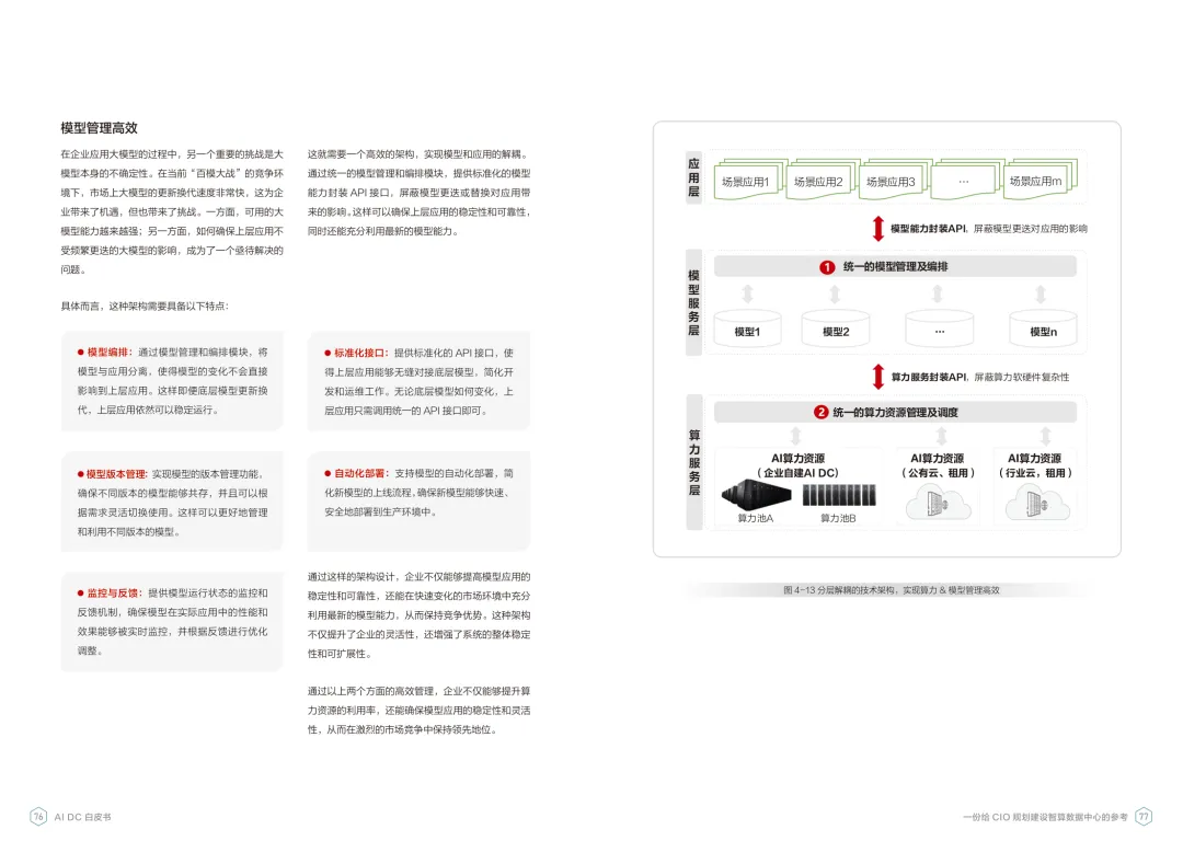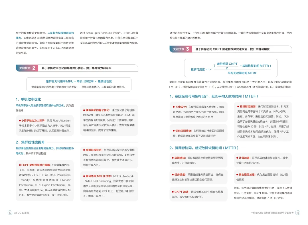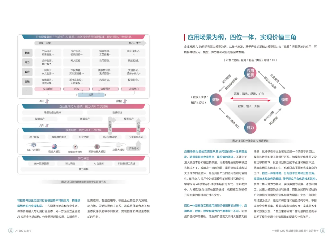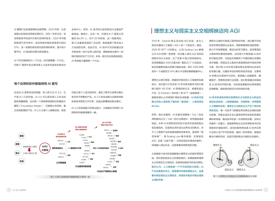 导读:报告聚焦智算数据中心建设,为企业 CIO 提供规划参考。随着 AI 成为不可逆转的趋势,算力已成为核心生产要素,传统数据中心难以满足 AI 训练与推理的高性能需求,智算数据中心(AI DC)应运而生,实现从成本中心向创新中心的转型。AI DC 与传统数据中心存在本质差异,采用全互联对等架构,以 xPU 为核心提供并行计算,单机柜功率密度显著提升,需液冷等高效散热技术支撑。其建设分为超大型、大型、小型三类,分别对应基础模型预训练、行业模型二次训练、轻量化推理等场景,核心特征涵盖系统摩尔、能基木桶、迭代式平台等五大维度。白皮书提出四大建设倡议,强调适度超前布局、集约化绿色发展、共建开放生态及筑牢解决方案、生态、人才三大底座。通过算存网协同优化、弹性能源配置、全链路安全防护等技术创新,AI DC 将为千行万业智能化转型提供坚实算力支撑,推动智能经济持续增长。