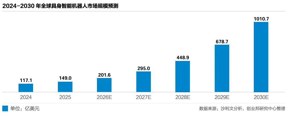根据IDC数据,2025年中国具身智能机器人用户支出预计超14亿美元,到2030年将飙升至770亿美元,年均复合增长率高达94%。沙利文预测,全球具身智能机器人市场规模将从2024年的117.1亿美元增长至2030年的1010.7亿美元,年复合增长率43.2%。