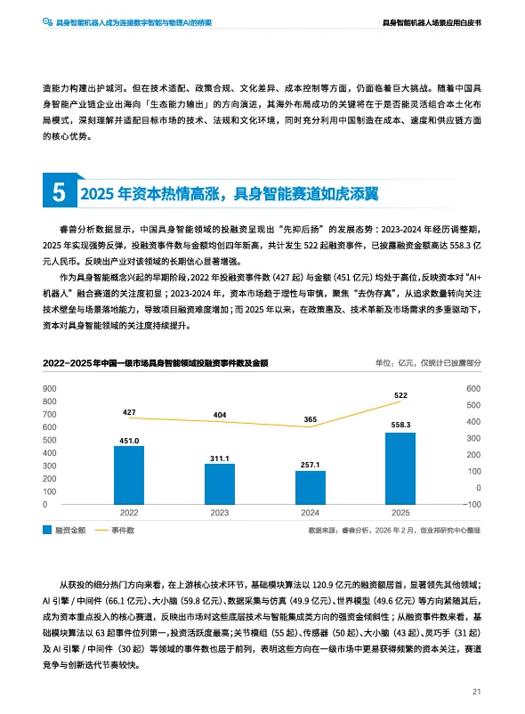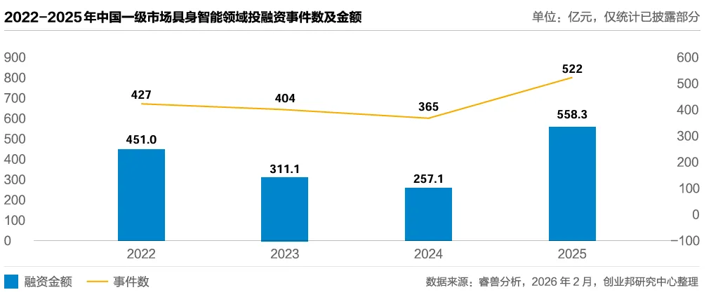 2025年,中国具身智能领域投融资事件数达522起,已披露融资金额高达558.3亿元,创下四年新高。