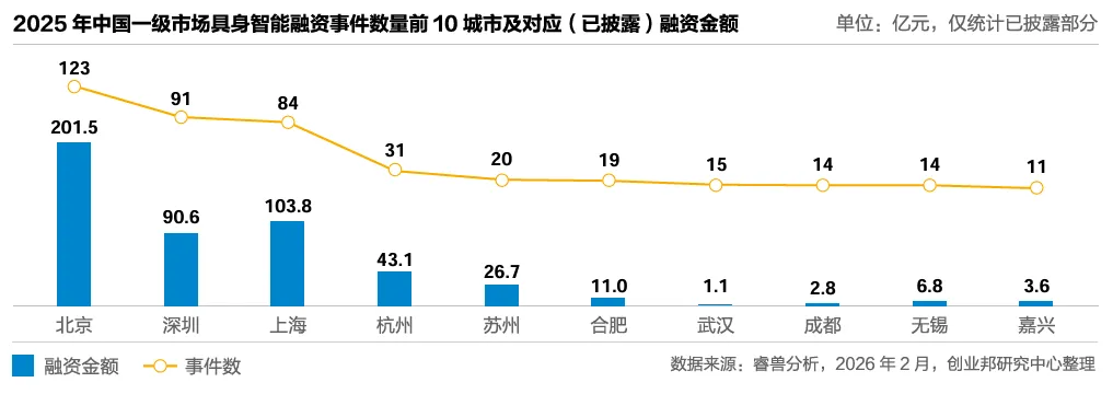 从区域分布看,北京(123起)、深圳(91起)、上海(84起)三城融资事件占前十城市约70%,融资总额占前十城市约80%。北京以201.5亿元遥遥领先,上海103.8亿元、深圳90.6亿元。
