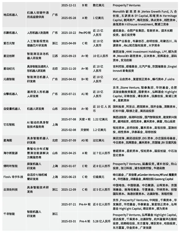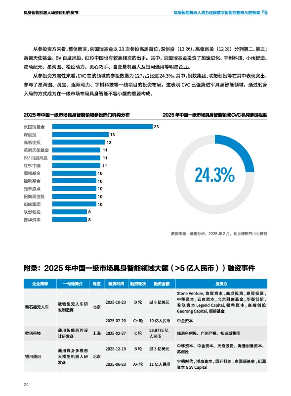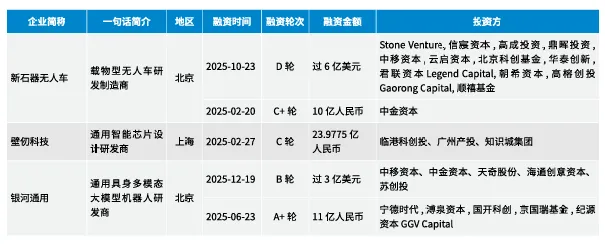 大额融资频现:新石器无人车D轮超6亿美元,银河通用B轮超3亿美元,乐聚机器人Pre-IPO轮近15亿人民币,星动纪元A+轮近10亿人民币。CVC强势入场,蚂蚁集团、联想创投等参与星海图、灵宝、逐际动力等一线项目投资。