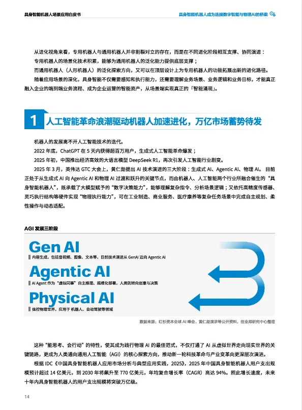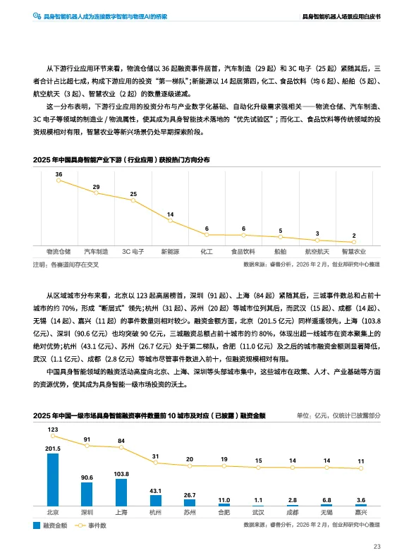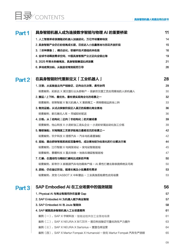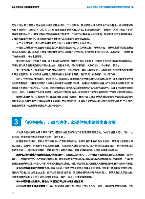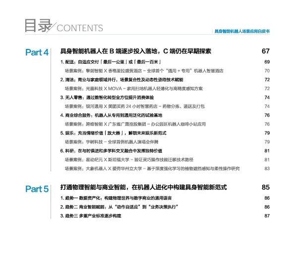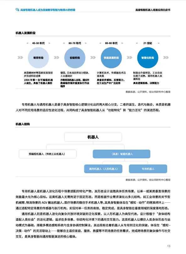 报告调研了近50家产业链核心企业,发现具身智能机器人已不再停留于单点演示,而是在工业制造、商业服务等领域形成了可复制的解决方案。
