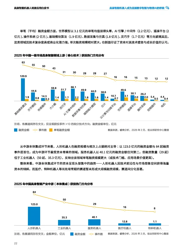 从细分方向看,上游基础模块算法(120.9亿元)、AI引擎/中间件(66.1亿元)、大小脑(59.8亿元)成为资本重点投入的核心赛道。中游本体集成环节,人形机器人以123.0亿元的融资金额与84起融资事件居首位,服务机器人(40.1亿元)、工业机器人(35.3亿元)紧随其后。